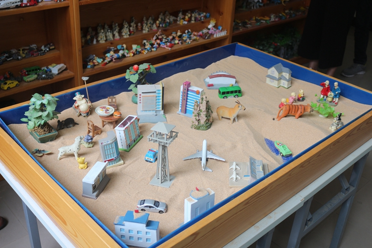 首先,赵建华老师详细讲解了沙盘游戏的定义、历史。随后,在赵老师的带领下轮流抽签进行。同学们兴致盎然在箱庭治疗室的沙箱中对未来展开细心的想象,制作沙盘,老师仔细记录同学们的动作和选取的玩具。制作完成后,各组成员交互相沟通交流对各自的作品提出别出心裁的主题命名。在赵老师做活动记录整理过程中,同学们便迫不及待的谈起自己在实践活动中的切身体会:轻松愉悦的氛围,自由自在的憧憬,既体现团体的责任感又改善了人际关系。