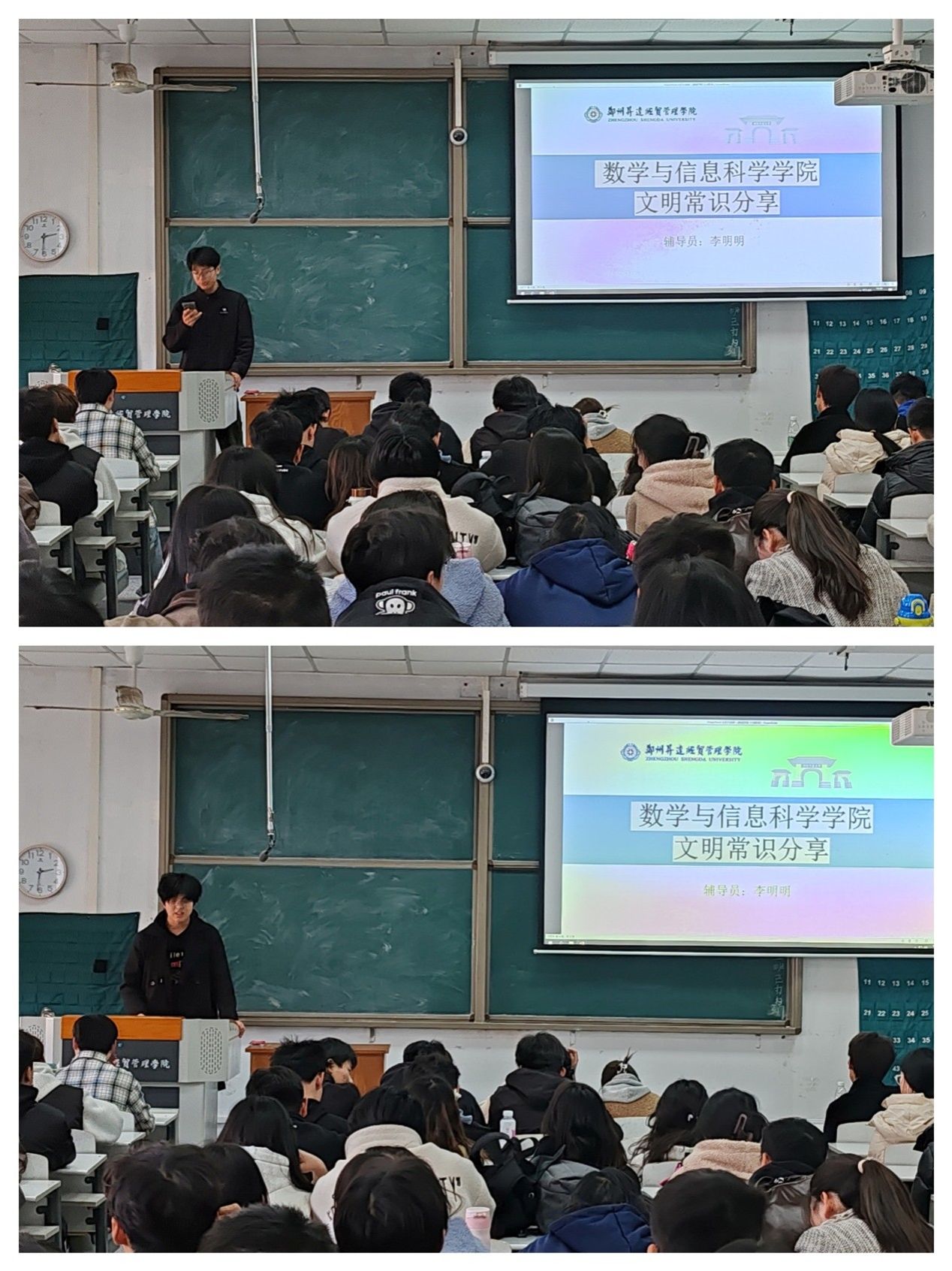 每周二,辅导员李明明利用班会时间组织开展“文明常识分享”活动。学生们积极参与,分享内容丰富,涵盖睡眠知识科普、作息调整技巧及助眠方法等睡眠知识,进一步加强学生对睡眠健康的关注,帮助学生以更加饱满的精神状态投入学习和生活。
