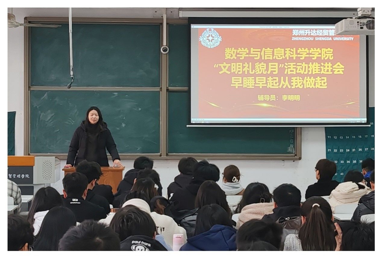 3月18日,“文明礼貌月”活动推进会于221教室顺利举行,辅导员李明明主持会议。会上,辅导员李明明强调睡眠质量对学生身心健康和学习效率的重要性,呼吁学生主动养成健康的生活习惯。同时,辅导员李明明鼓励学生积极参与“文明礼貌月”系列活动,激发学生对活动的参与热情,营造出“全员参与、共践文明”的良好氛围,推动着数学与信息科学学院在文明建设的道路上稳步前行。