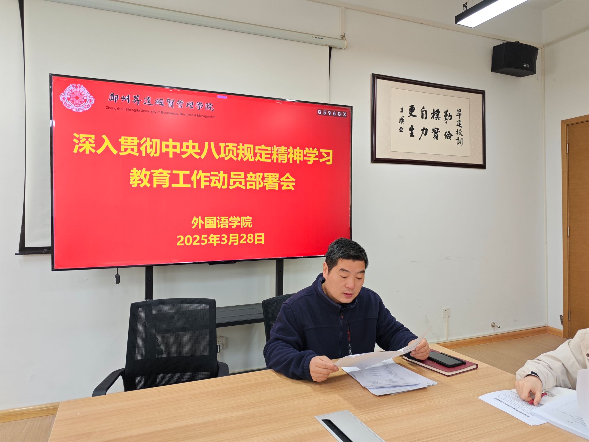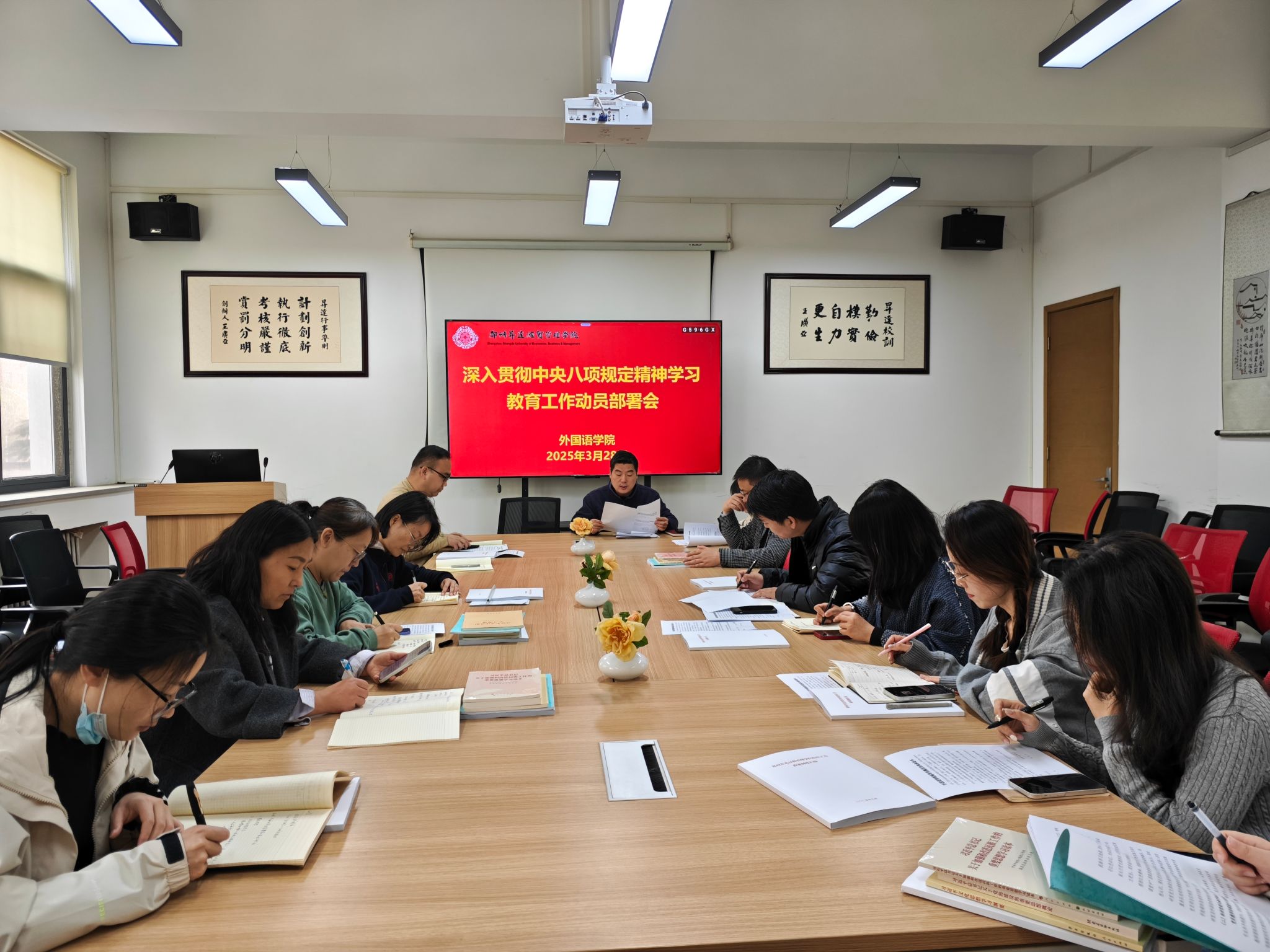 2025年3月28日,外国语学院在206会议室召开了深入贯彻中央八项规定精神学习教育工作动员部署会。会议由院党委书记石皓召同志主持,院党委全体委员和各党支部书记参与。