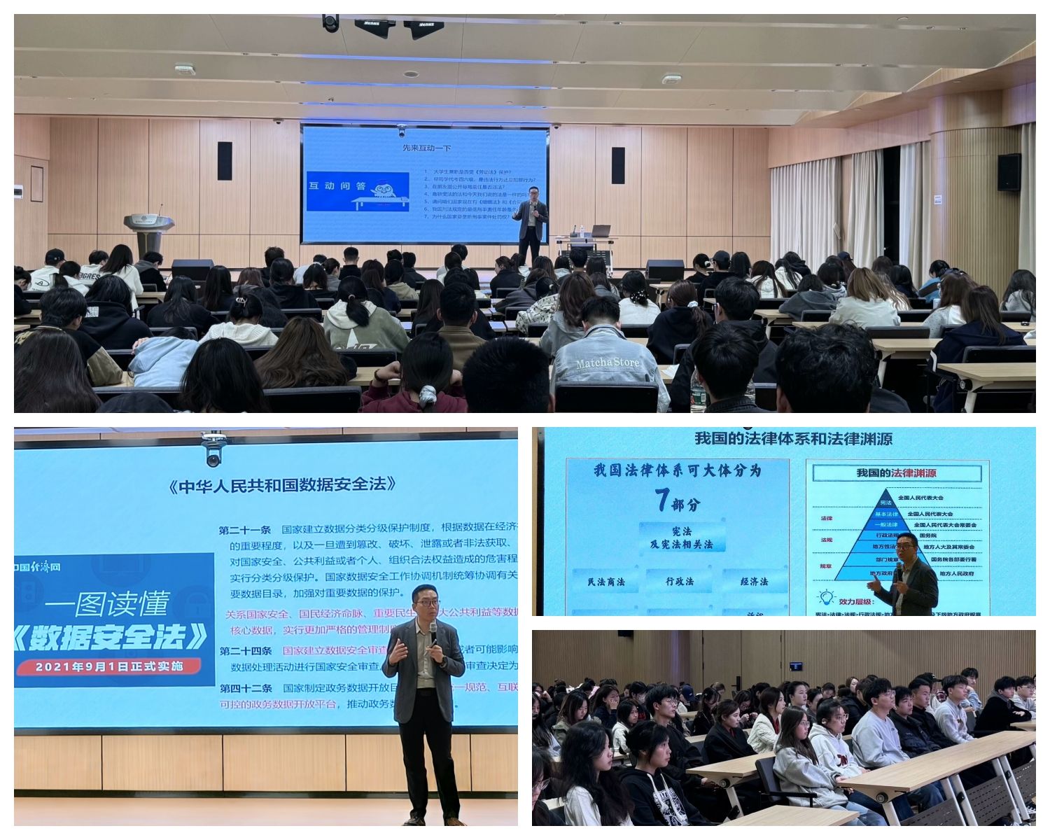 报告会围绕“法律体系”与“国家安全”两大主题展开。闫准律师首先解析我国法律渊源与体系,强调《宪法》作为根本法的基础作用,并阐明《宪法》《刑法》《中华人民共和国国家安全法》三大法律的互补关系:《宪法》确立国家安全原则,《刑法》惩治和预防犯罪,《中华人民共和国国家安全法》构建制度框架。同时,闫准律师列举了与国家安全直接相关的《中华人民共和国反间谍法》《中华人民共和国网络安全法》《中华人民共和国数据安全法》等十二部法律,强调其覆盖政治、军事、网络等多领域安全需求。在国家安全教育环节,他结合案例警示风险,如某学生因轻信“高薪兼职”泄露国家机密、境外势力利用网络窃取科技数据等,呼吁学生警惕日常生活中的安全隐患。活动还通过互动问答等形式,帮助学生掌握防范技能。