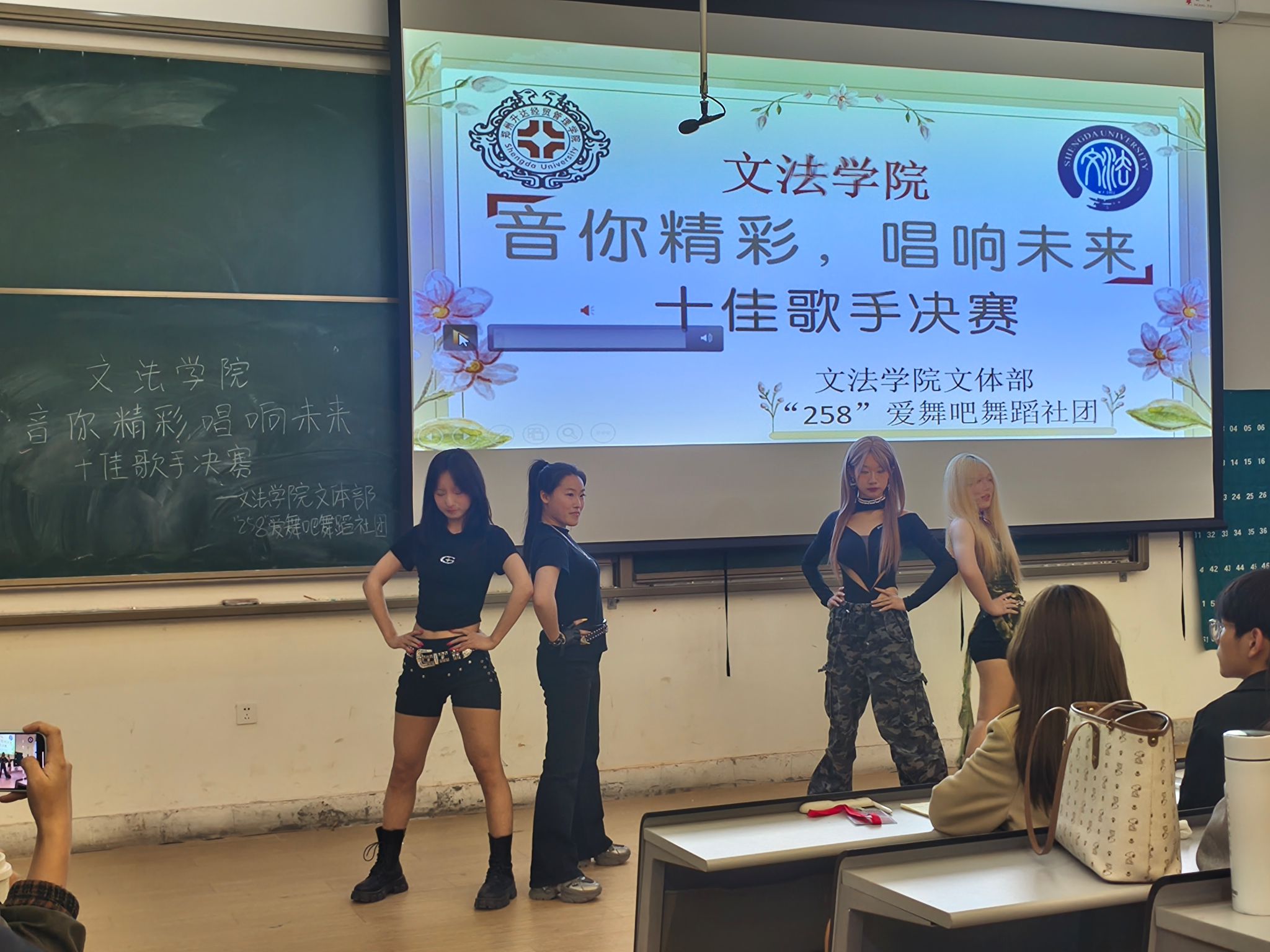 此次大赛在主持人的介绍下拉开帷幕。经过初赛、复赛层层选拔后脱颖而出的13位参赛选手依次登台,带来了精彩绝伦的演出。他们用歌声点燃梦想,让现场观众深切感受到了参赛选手对音乐的热爱、对生活的深刻感悟,彰显着青春的无限激情与才华。比赛过程中,现场气氛热烈,掌声、欢呼声此起彼伏。在大赛的尾声,由文法学院258爱舞吧舞蹈社团带来的精彩舞蹈,再一次调动了现场氛围,展现青春的跃动。经过激烈角逐,2024 级法学本科 3 班蒋娉凭借一曲《如果可以》脱颖而出,斩获一等奖;2024 级学前教育专科 1 班邓梓铭、张嘉怡合唱的《遗失的心跳》以及张嘉怡独唱的《年轻姑娘应该懂得》荣获二等奖;2024 级汉语言文学本科 7 班吴睿斐的《路过人间》、2024 级网络与新媒体本科 2 班单意恒的《怪咖》、2024 级法学本科 1 班王一淳的《手心的蔷薇》获得三等奖。最后,刘唯伊老师对选手们的表现进行点评,肯定选手们的精彩表现,并鼓励大家踊跃参加比赛,积极锻炼自己。