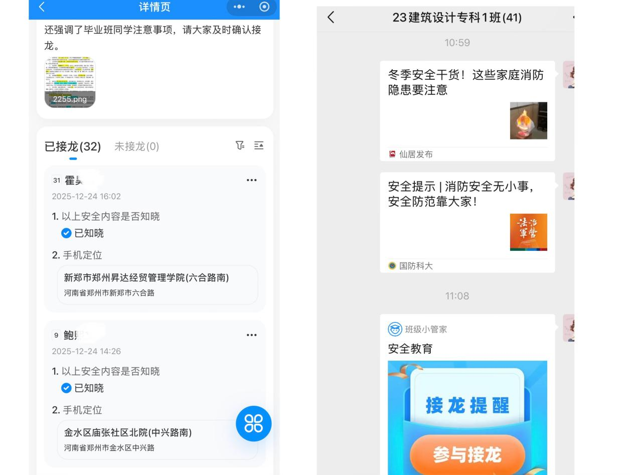 针对校外住宿、实习学生,各班通过线上班会,推送消防安全知识,内容涵盖水电使用安全、电动自行车规范充电、消防通道保持畅通、实习场地设备操作规范、实习单位应急疏散路线图等生活化场景,辅以真实案例剖析,引导学生识别并消除身边的安全隐患。