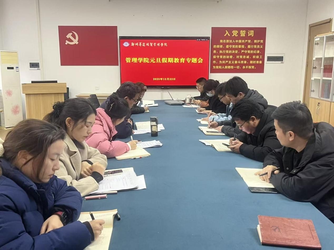 为强化学生“元旦”假期安全教育,提高学生安全文明意识,管理学院于12月23日在305会议室召开了“元旦”假期安全教育专题会议,旨在加强学院安全管理,确保师生安全。管理学院党委书记职正路、党委副书记许广庆和全体辅导员参加了此次会议,会议由党委副书记许广庆主持。