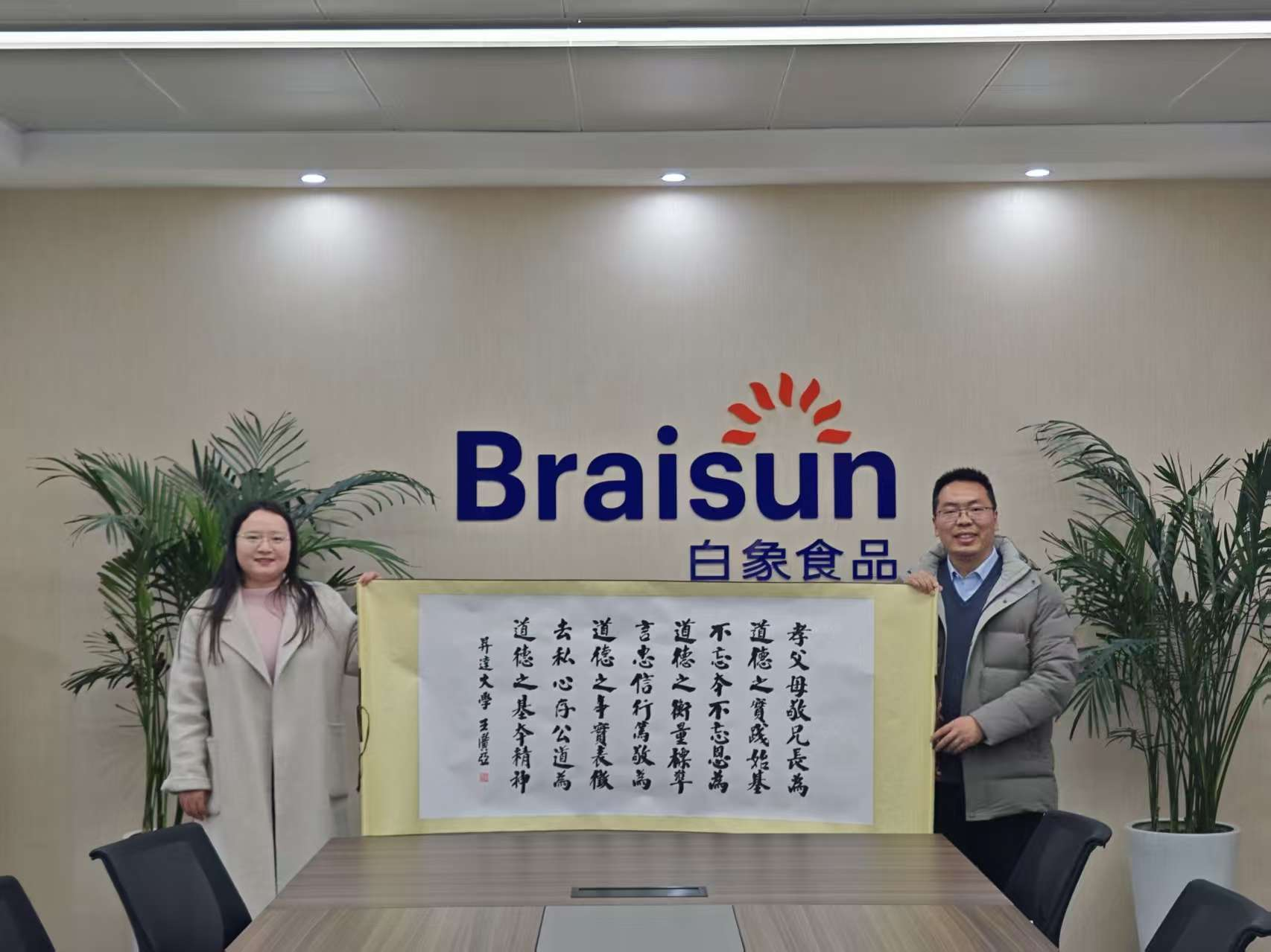 座谈环节中,双方围绕校企课程共建、实践教学基地建设、产学研项目合作等议题展开务实交流。白朋飞院长代表学院向白象食品集团创办人赠送了象征中华传统美德与文化传承的《孝道篇》,寓意校企双方在“立德树人”与“实业报国”理念上的深度共鸣,为未来合作奠定了文化与价值基础。参会教师结合各自专业方向,从电商运营、智慧物流、品牌创新等角度与企业代表展开热烈讨论,初步达成了课程共建、案例共研、师资互聘等多维合作意向。