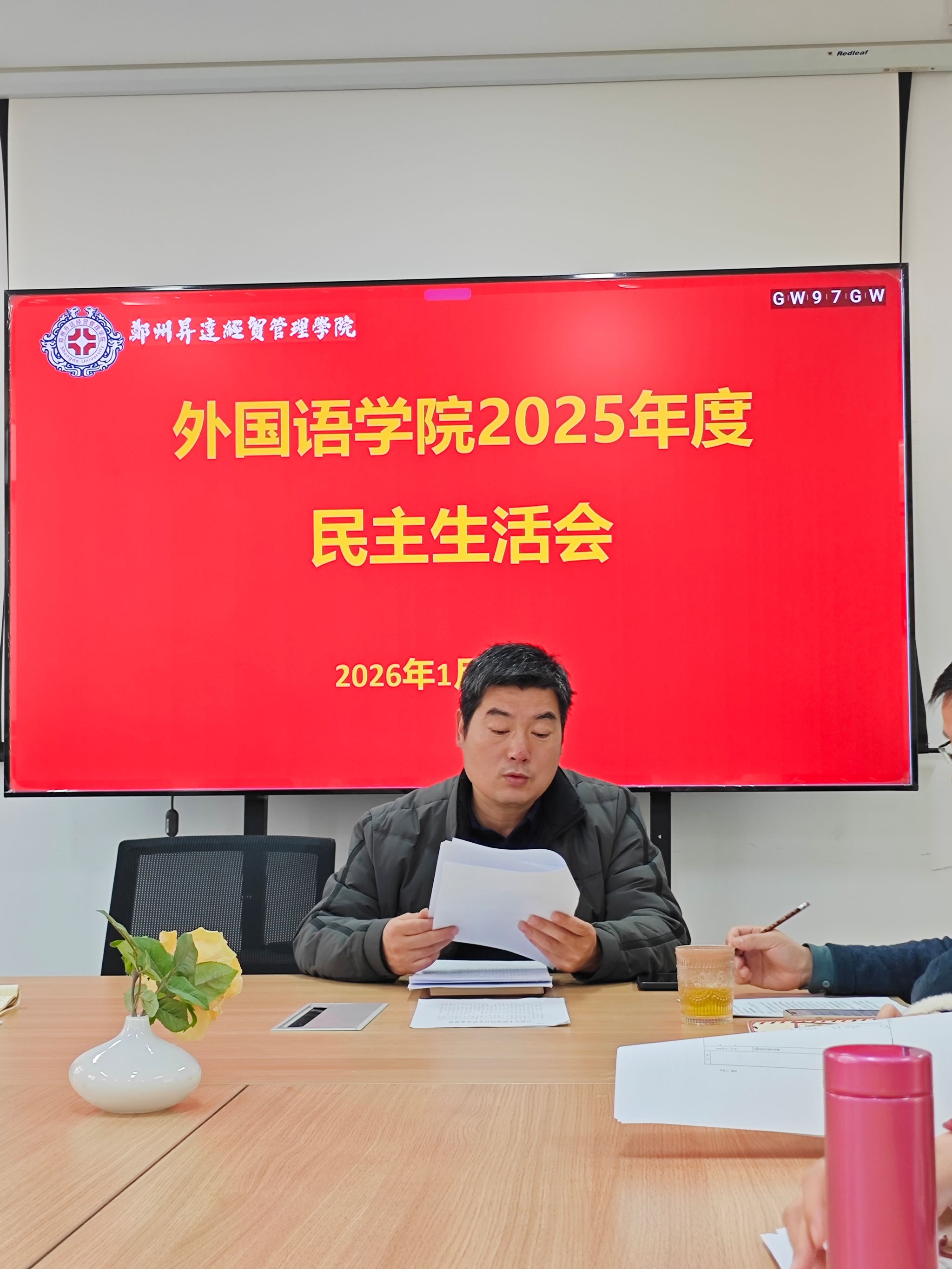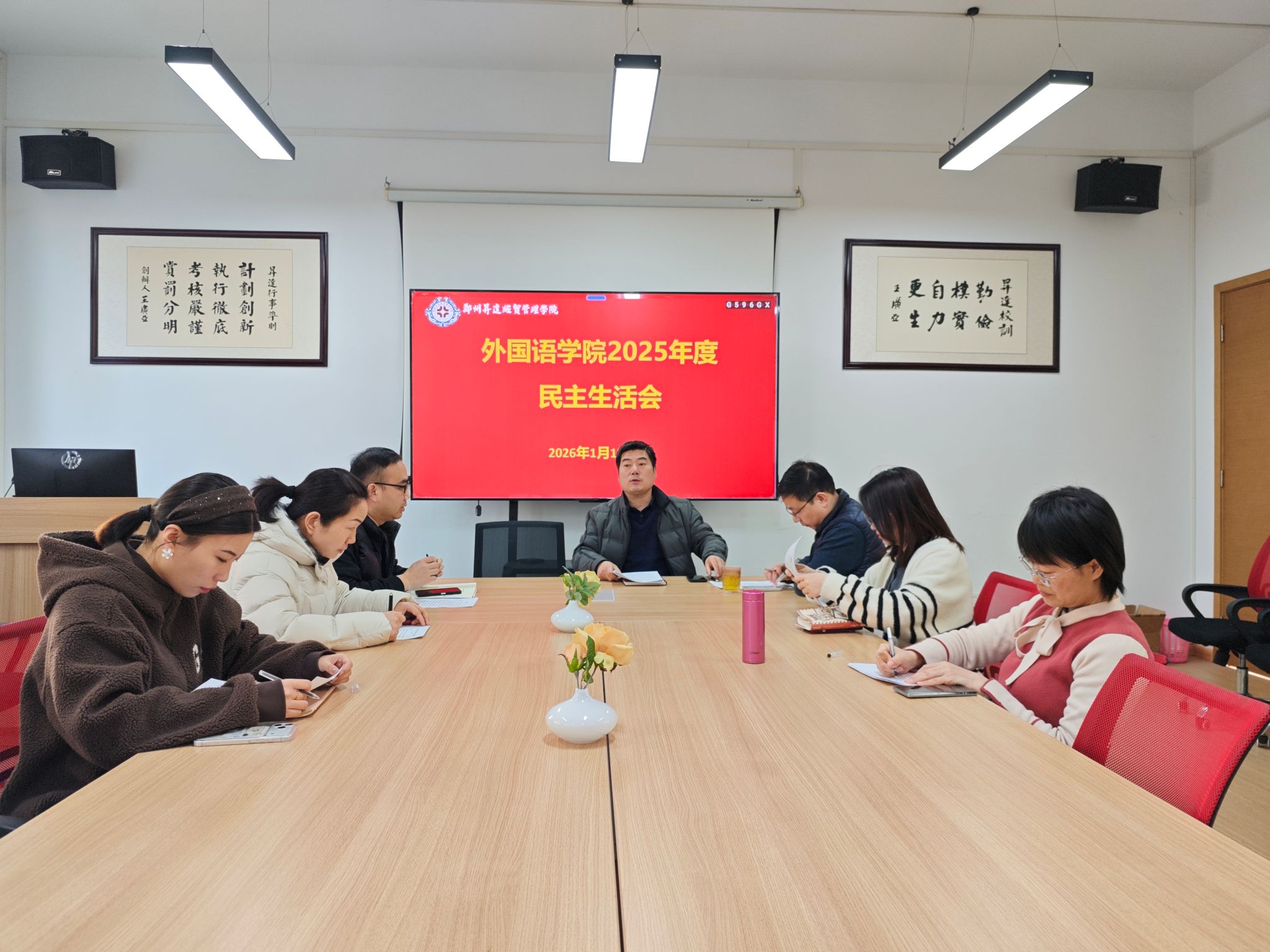 2026年1月13日上午,外国语学院在206会议室召开2025年度党员领导干部民主生活会。会议紧扣“带头强化政治忠诚、增强党性修养、勇于担当作为、严守纪律规矩”主题,深入学习贯彻党的二十大和二十届历次全会精神,全面落实习近平总书记关于党的自我革命和作风建设的重要指示精神。院党委书记石皓召主持会议,全体党委班子成员参加会议。