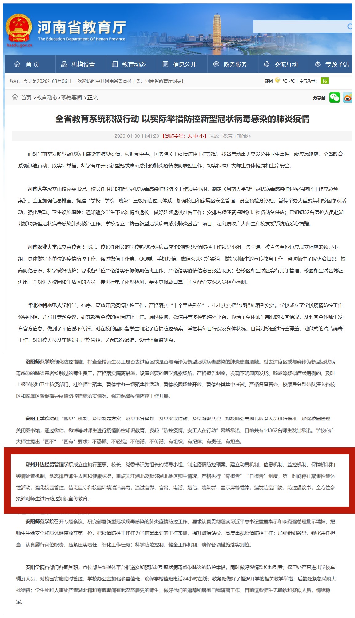 2020年1月30日,河南省教育厅官方网站豫教要闻栏目发布题为《全省教育系统积极行动 以实际举措防控新型冠状病毒感染的肺炎疫情》的综合文章一篇,介绍全省教育系统面对突发新型冠状病毒感染的肺炎疫情迅速行动,如何以实际举措,科学有序开展新型冠状病毒感染的肺炎疫情联防联控工作,切实保障广大师生身体健康和生命安全。其中报道了我校在该项工作中的典型做法。现将原文摘录如下: