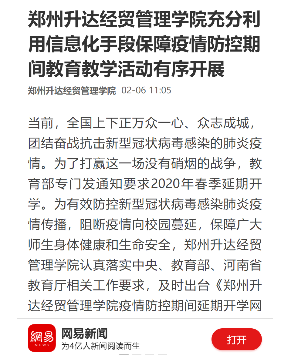 2020年2月6日,网易新闻发布题为《郑州升达经贸管理学院充分利用信息化手段保障疫情防控期间教育教学活动有序开展》的新闻一篇,介绍我校如何在延期开学期间,做到 “停课不停学 教学不延期”,确保全校师生在延迟开学期间的教育教学不断线。现将原文摘录如下: