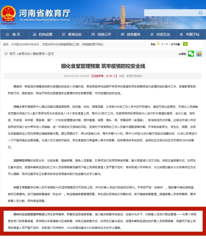 2020年2月8日,河南省教育厅官方网站豫教要闻栏目发布题为《细化食堂管理预案 筑牢疫情防控安全线》的综合文章一篇,介绍省教育系统在新型冠状病毒感染肺炎疫情防控关键阶段就开学后校园食堂安全管理和学生就餐问题如何制定预案,守好疫情防控安全线。其中报道了我校在该项工作中的典型做法。现将原文摘录如下: