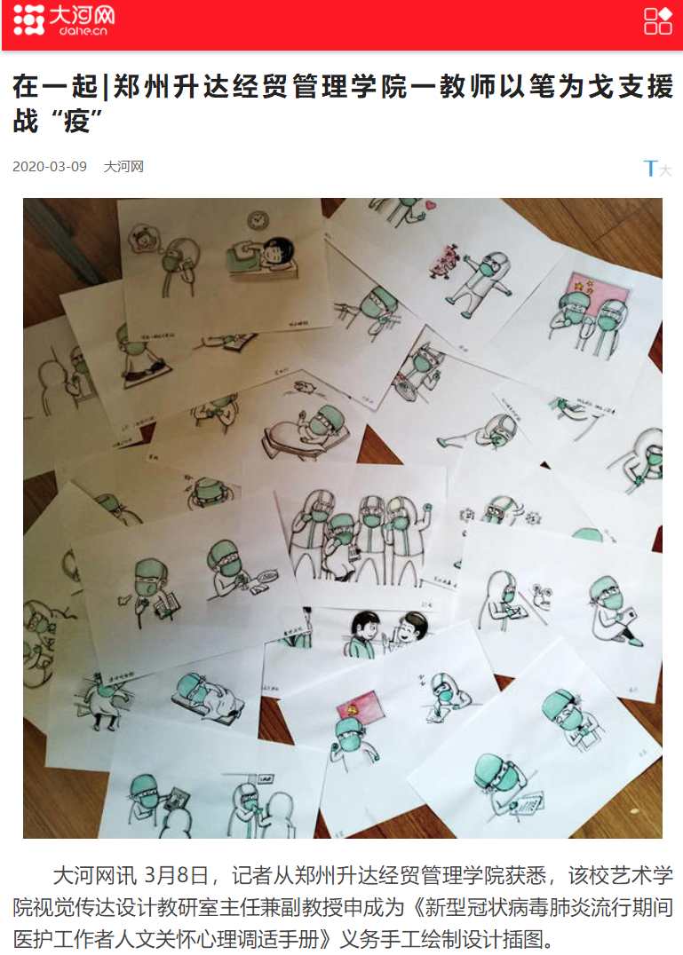 2020年3月9日,大河网以《在一起|郑州升达经贸管理学院一教师以笔为戈支援战“疫”》为题,报道了我校作为河南省为公众义务提供应对疫情心理辅导的42所高校之一,在受到河南省护理协会编委会的邀请后,艺术学院视觉传达设计教研室主任申成副教授为《新型冠状病毒肺炎流行期间医护工作者人文关怀心理调适手册》义务设计插图的事迹。现将原文摘录如下: