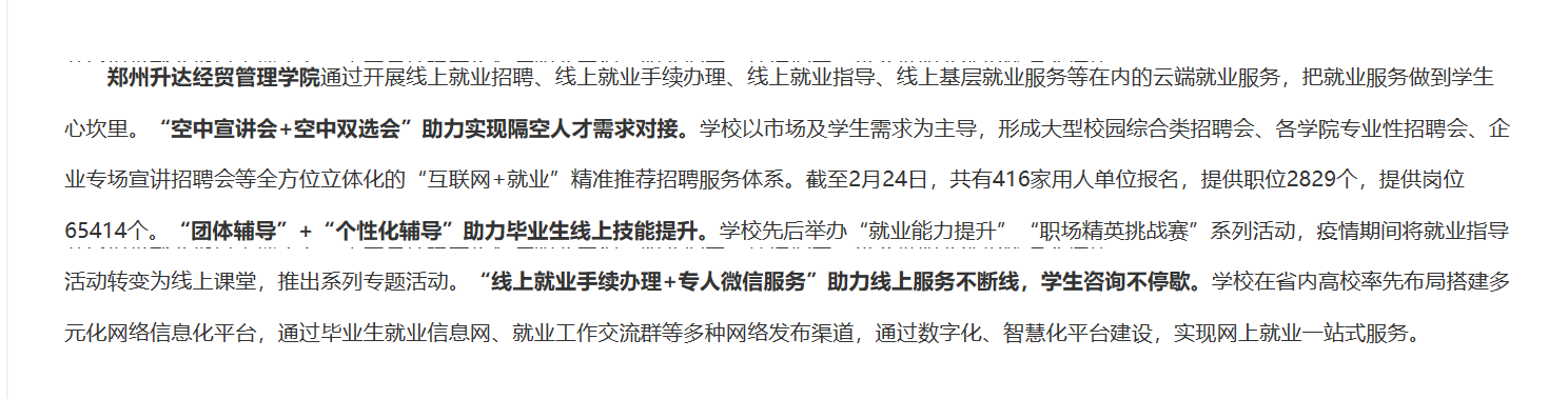 郑州升达经贸管理学院通过开展线上就业招聘、线上就业手续办理、线上就业指导、线上基层就业服务等在内的云端就业服务,把就业服务做到学生心坎里。“空中宣讲会+空中双选会”助力实现隔空人才需求对接。学校以市场及学生需求为主导,形成大型校园综合类招聘会、各学院专业性招聘会、企业专场宣讲招聘会等全方位立体化的“互联网+就业”精准推荐招聘服务体系。截至2月24日,共有416家用人单位报名,提供职位2829个,提供岗位65414个。“团体辅导”+“个性化辅导”助力毕业生线上技能提升。学校先后举办“就业能力提升”“职场精英挑战赛”系列活动,疫情期间将就业指导活动转变为线上课堂,推出系列专题活动。“线上就业手续办理+专人微信服务”助力线上服务不断线,学生咨询不停歇。学校在省内高校率先布局搭建多元化网络信息化平台,通过毕业生就业信息网、就业工作交流群等多种网络发布渠道,通过数字化、智慧化平台建设,实现网上就业一站式服务。