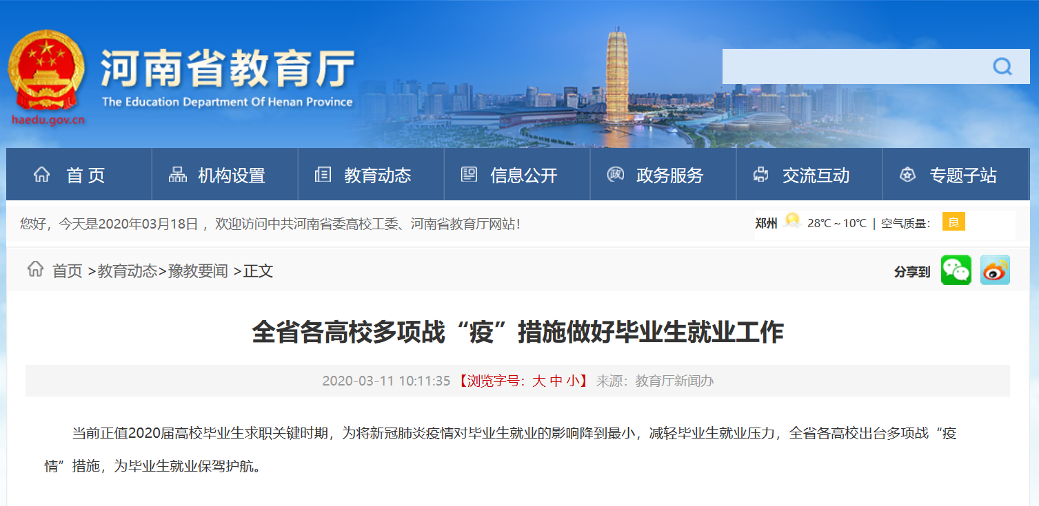 2020年3月11日,河南省教育厅官方网站豫教要闻栏目发布题为《全省各高校多项战“疫”措施做好毕业生就业工作》的综合文章一篇,介绍当前适逢2020届高校毕业生求职关键时期,为将新冠肺炎疫情对毕业生就业的影响降到最小,减轻毕业生就业压力,全省各高校出台多项战“疫情”措施,为毕业生就业保驾护航。其中报道了我校在该项工作中的典型做法。现将原文摘录如下: