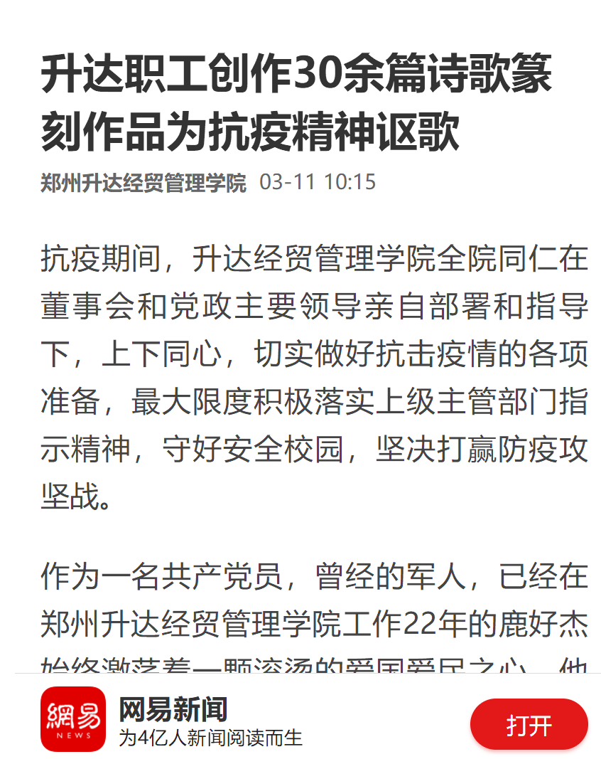 2020年3月11日,网易新闻以《升达职工创作30余篇诗歌篆刻作品为抗疫精神讴歌》为题,报道了我校职工鹿好杰以爱国爱民之心用手中笔杆和篆刻刀创作艺术作品,用诗歌和篆刻作品歌颂新冠肺炎疫情中伟大的逆行者,为他们加油助威,向他们致敬,祝愿他们凯旋归来,祝愿祖国早日战胜疫情,人民幸福安康的事迹。现将原文摘录如下: