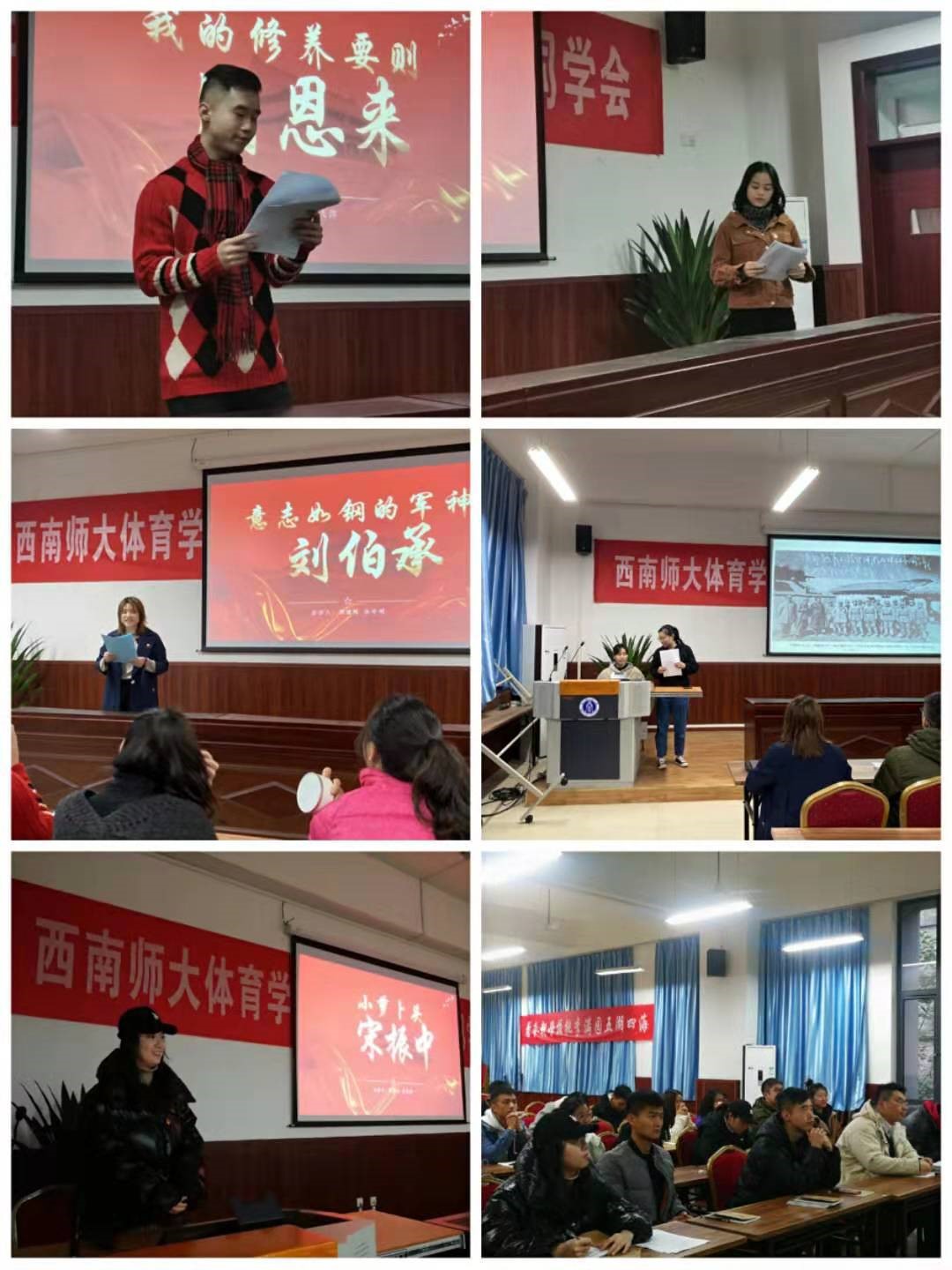 体育学院研究生二支部深入贯彻落实习近平总书记视察重庆时提出的“重庆要运用这些红色资源、教育引导广大党员、干部坚定理想信仰,养成浩然正气”的要求,利用“三会一课”等形式,开展主题为“讲红色故事,做红色传人”的活动。旨在讲红色故事,弘扬革命精神,培育党员同志和积极分子的爱国主义精神,争做红色传人。