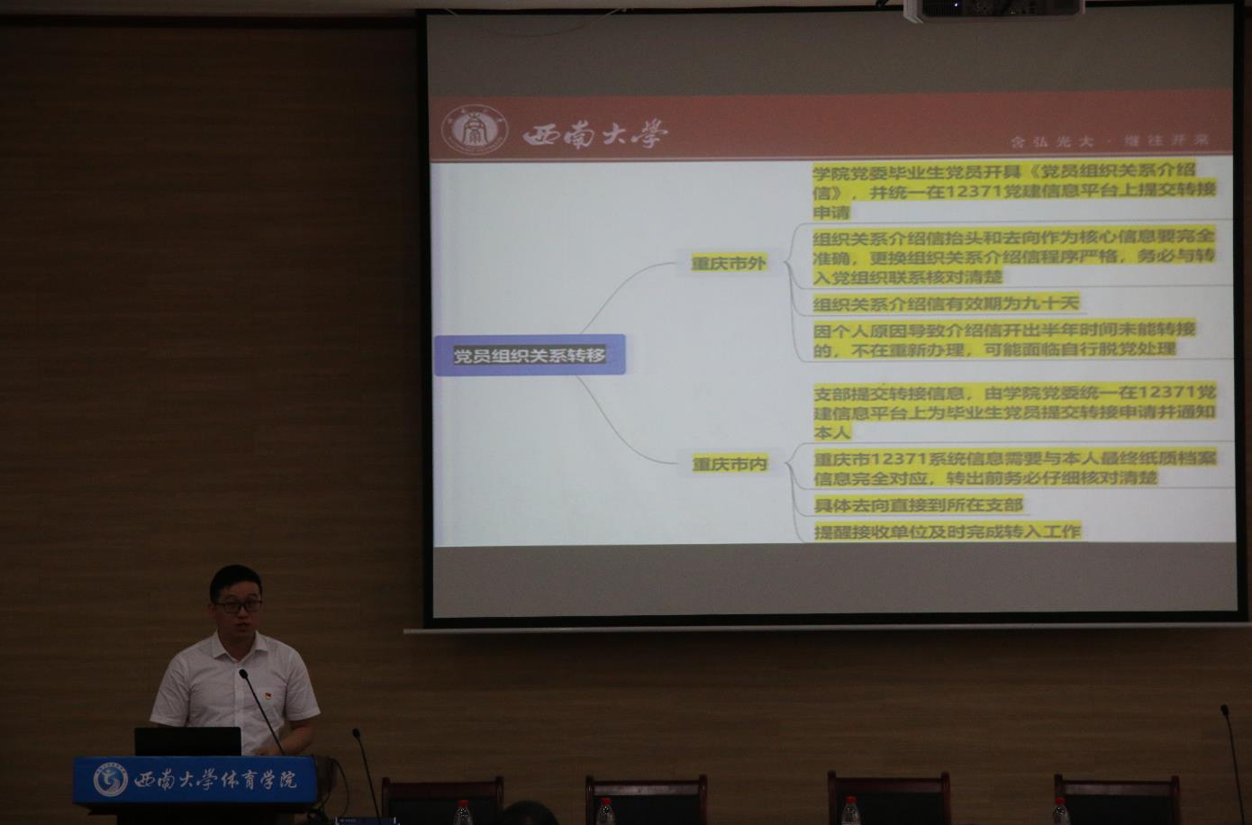 6月18日,体育学院党委在学院109报告厅举行毕业生党员专题教育,学院党委委员、毕业党支部支部书记、毕业生党员和新发展党员代表参会。