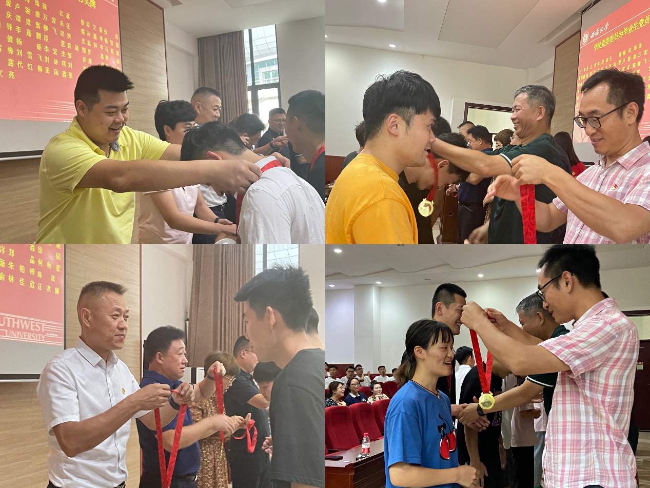 刘杰同志发言结束后,体育学院党委委员为毕业生党支部学生支委颁发聘书,并向全体毕业生党员赠送纪念奖牌。