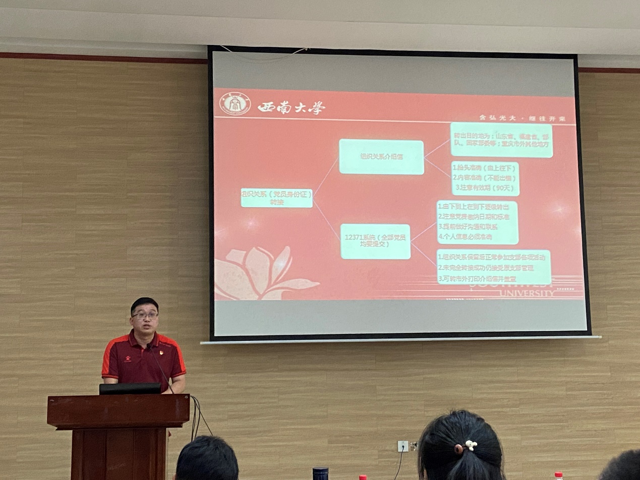 第二阶段,学院组织毕业生党员进行专题教育活动。组织员李进为毕业生党员做组织关系转接专题培训,刘杰同志作为毕业研究生党员代表发言