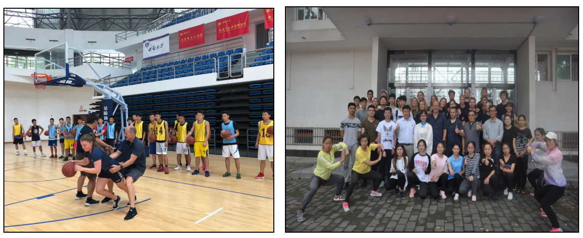 在我校体育学院教师和学生的陪同下,葛莱体院师生参观了我校综合体育馆,15名学生亲身参与体验了我校杨明老师的武术课,并表示,中国的文化博大精深,非常荣幸切身参与这样的武术课的学习,感受中国传统文化。在体育学院中心体育馆,葛莱体育教育与运动学院副校长Lars Koed Mogensen也亲授了一堂篮球课,与我院体育教育专业篮球班的学生进行了深度交流,并且亲自示范篮球技术动作。