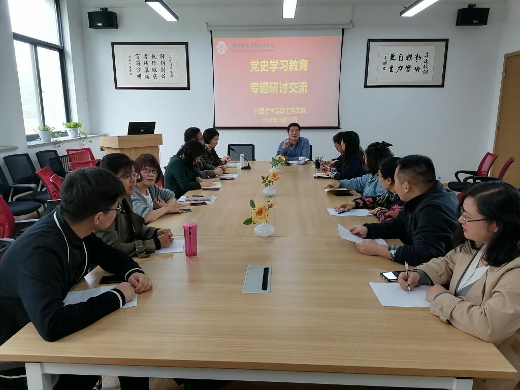 4月22日下午,外国语学院全体教师党员在学院会议室开展党史学习教育专题研讨,结合学院党史学习教育实施方案,共同讨论落实教各教工党支部4-5月份党史学习教育内容的具体措施。外国语学院党总支书记石皓召同志、副书记崔瑾英同志作为党员参加此次研讨。