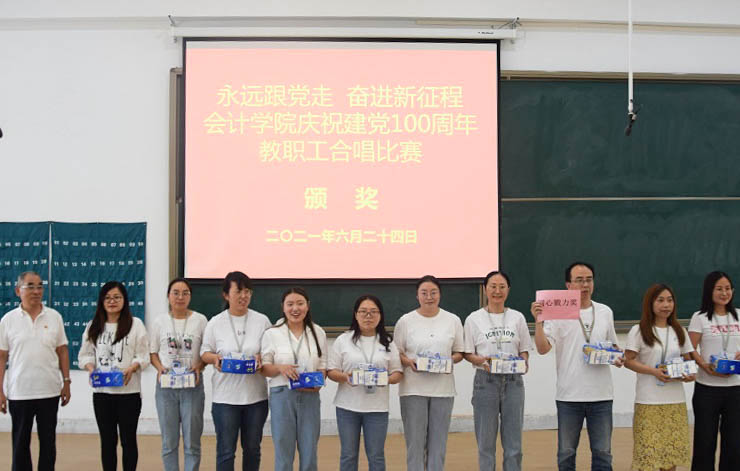 为热烈庆祝中国共产党成立100周年,进一步丰富教职工文化生活,全面展示新时代会计学院教职工的新气象,会计学院工会于6月24日下午在教学四号楼118教室举办了“永远跟党走奋进新征程”庆祝建党100周年教职工合唱比赛。比赛由会计学院行政秘书兼团委书记、工会主席陈刚老师主持,全院教职工热情高涨、精心准备,积极组队参加了比赛。