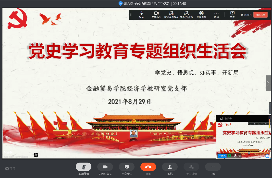 为认真贯彻“学史明理、学史增信、学史崇德、学史力行”的要求,引导广大党员增强“四个意识”、坚定“四个自信”、做到“两个维护”,8月29日晚7时,经济学教研室党支部共23名党员同志通过线上钉钉会议的形式开展“党史学习教育”专题组织生活会。支部书记刘合群同志担任主持人。