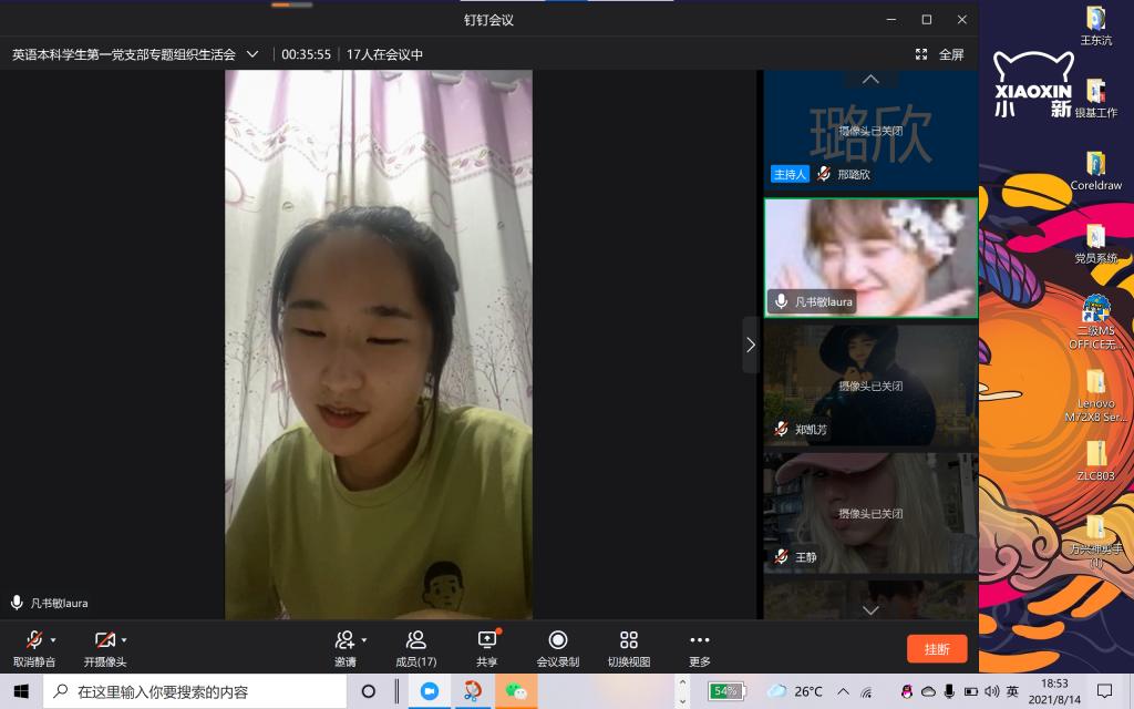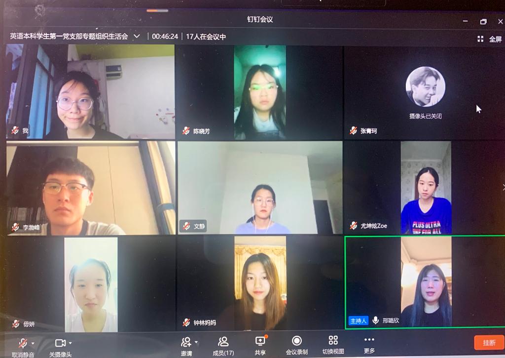 为深入学习贯彻习近平新时代中国特色社会主义思想,巩固深化党史学习教育成果,扎实推进“学党史、悟思想、办实事、开新局”专项行动,根据学院党委工作安排和统一部署,8月14日下午,外国语学院英语专业本科学生第一党支部线上召开党史学习教育专题组织生活会。会议由党支部书记邢璐欣主持,英语专业本科学生第一党支部全体党员参会。
