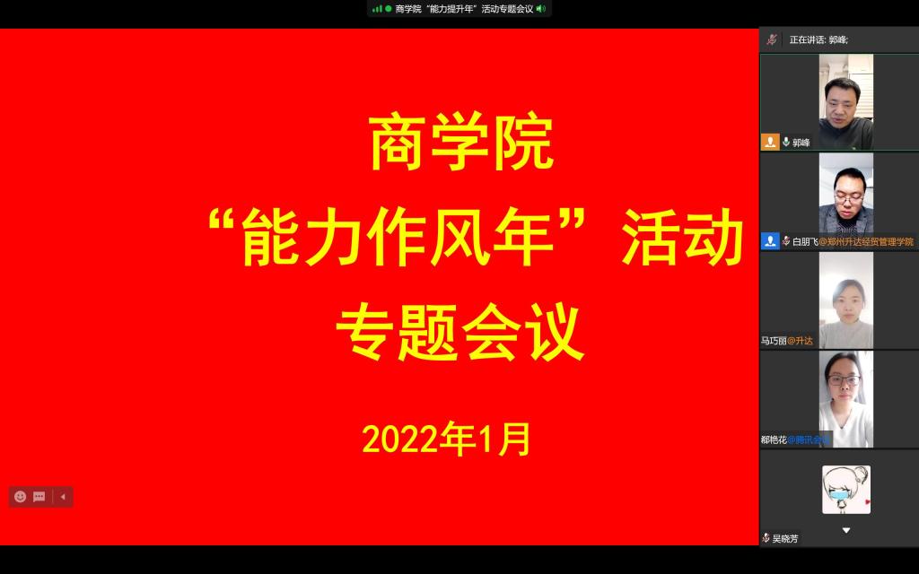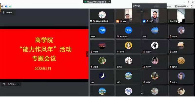 为深入学习学校“能力作风年”活动实施方案和动员大会领导讲话精神,扎实推进商学院“能力作风建设年”活动的开展,1月20日上午,商学院在线上组织全体教工召开“能力作风年”活动专题会议。商学院党委书记郭峰、副院长白朋飞、行政秘书郗艳花、教学秘书马巧丽、组织员吴晓芳以及全体专职教工参加了此次会议。会议由院党委书记郭峰主持。