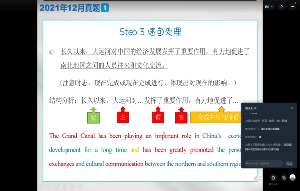 随后,张老师以2021年12月份大学英语四级考试3套真题里的汉英段落翻译为例,详细介绍了上述翻译技巧在实际解题中的应用。