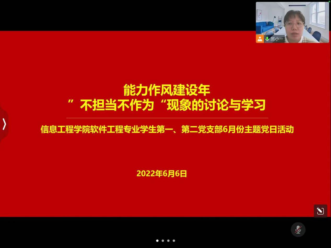 6月6日晚上,信工学院软件工程专业学生第一和第二党支部开展线上以“能力作风建设年‘不担当不作为’现象的讨论与学习”为主题的党日活动,支部全体党员参加了此次会议。