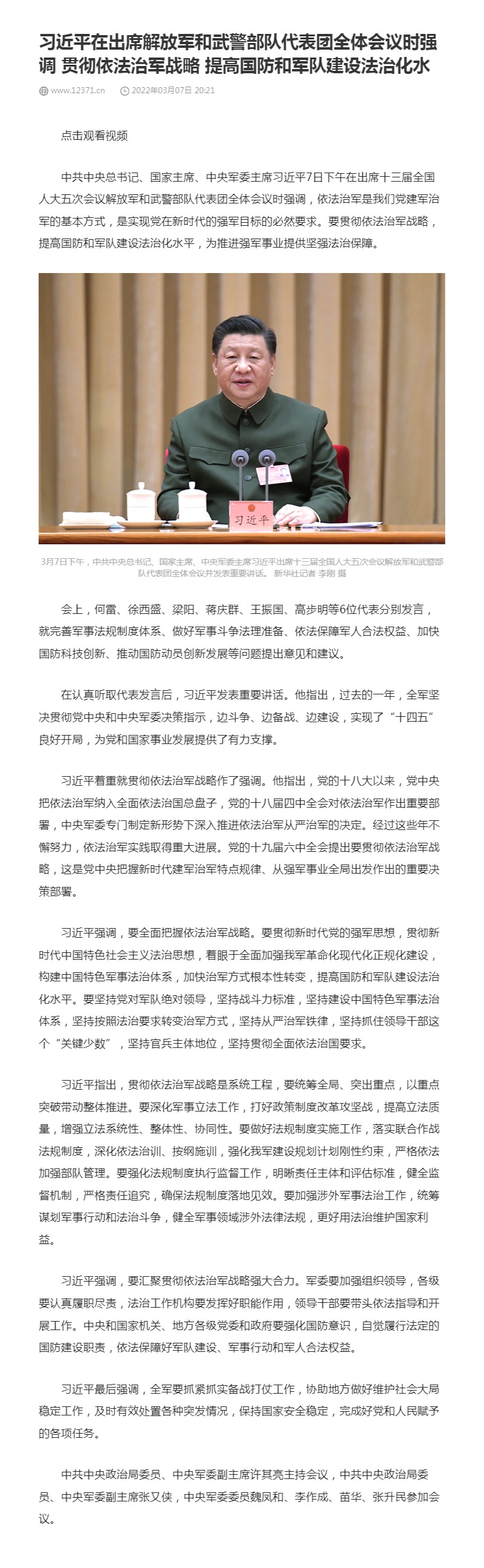 【习近平最新系列重要讲话】习近平:贯彻依法治军战略 提高国防和军队建设法治化水平