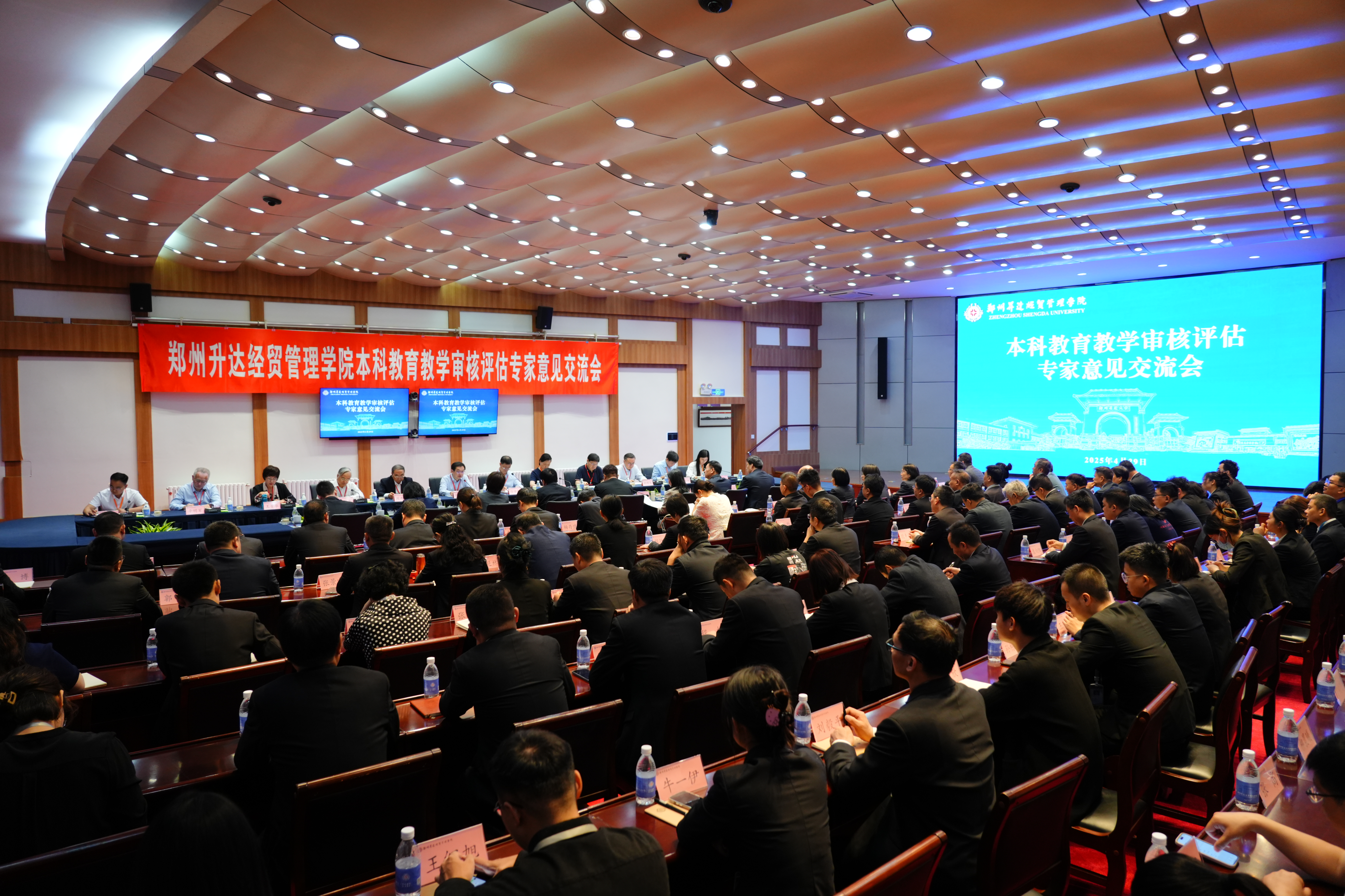 本科教育教学审核评估专家组意见交流会在我校行政楼国际会议厅主会场召开。教育部本科教育教学审核评估专家组全体成员,河南省教育厅副厅长朱自锋、高等教育处相关负责同志,河南省高等学校教育教学评估管理服务中心主任祝玉华,以及我校全体在校校领导,各学院党委书记、院长,各职能部门主要负责人等出席专家意见交流会。各单位科级干部,教学单位专业负责人、教研室主任、骨干教师代表,辅导员,教务处、评建办工作人员,学生代表等在新图书馆第三报告厅分会场参加会议。会议由徐绪卿主持。