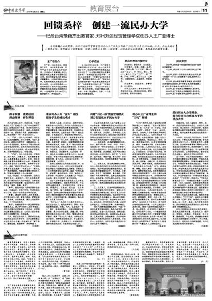 12月28日,《中国教育报》11版“教育展台”整版刊登《回馈桑梓 创建一流民办大学》一组文章,以纪念台湾豫籍杰出教育家、郑州升达经贸管理学院创办人王广亚先生逝世一周年,赞扬在教育事业上做出的卓著成就。