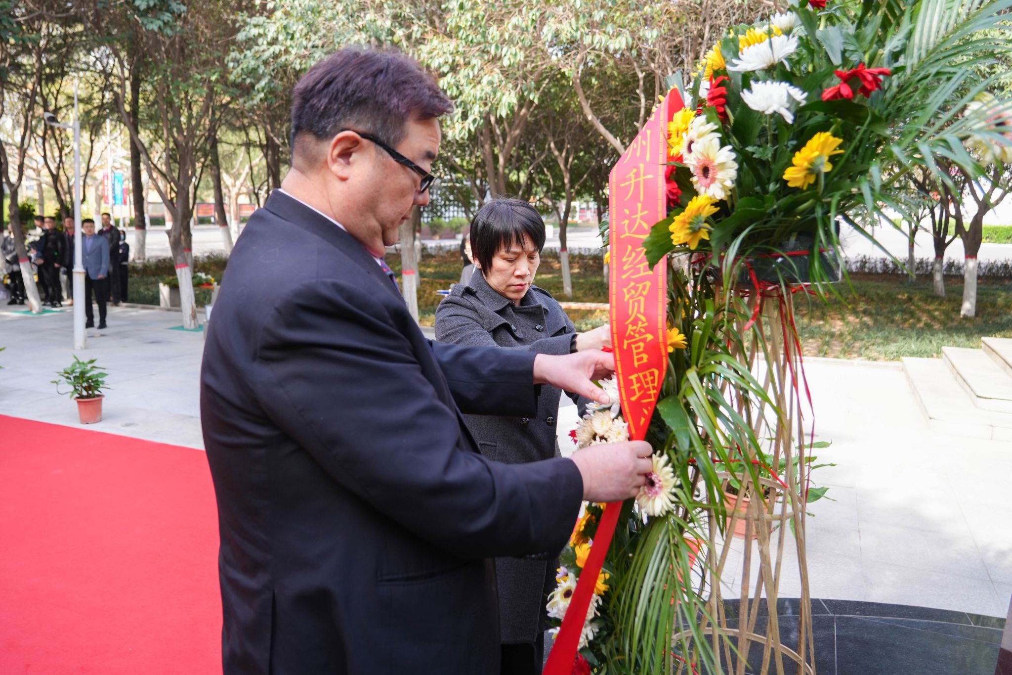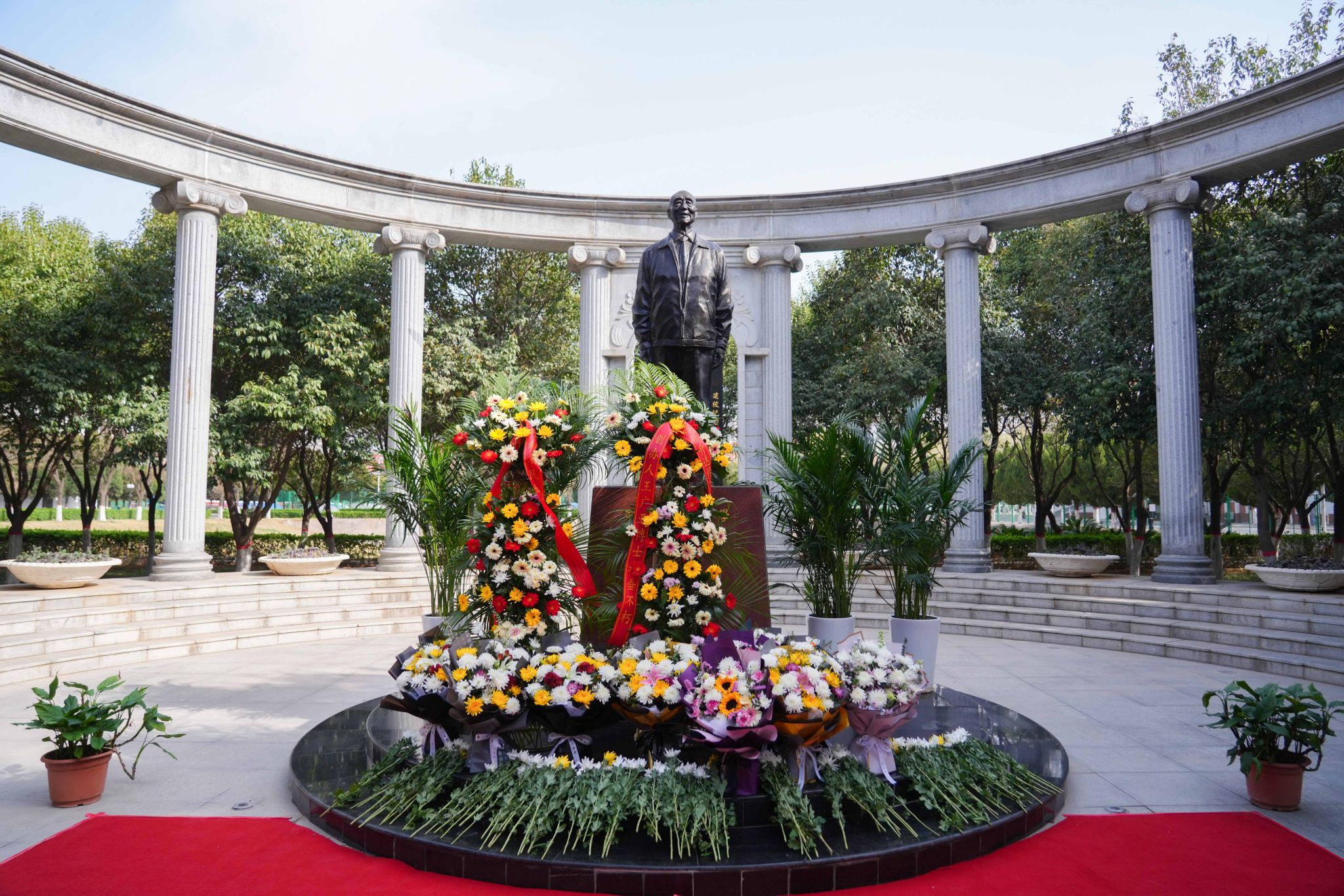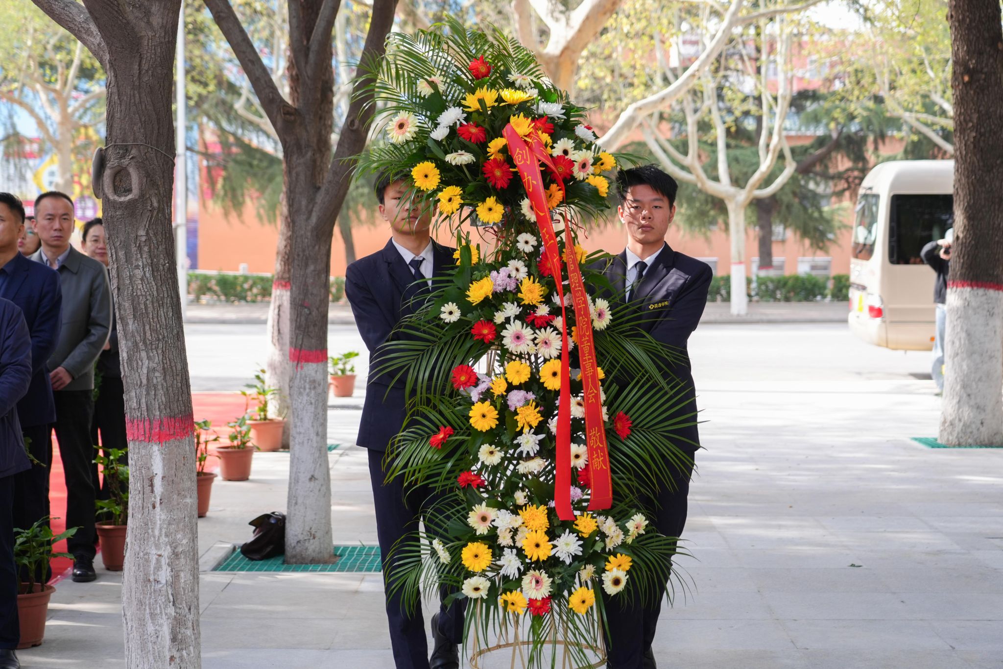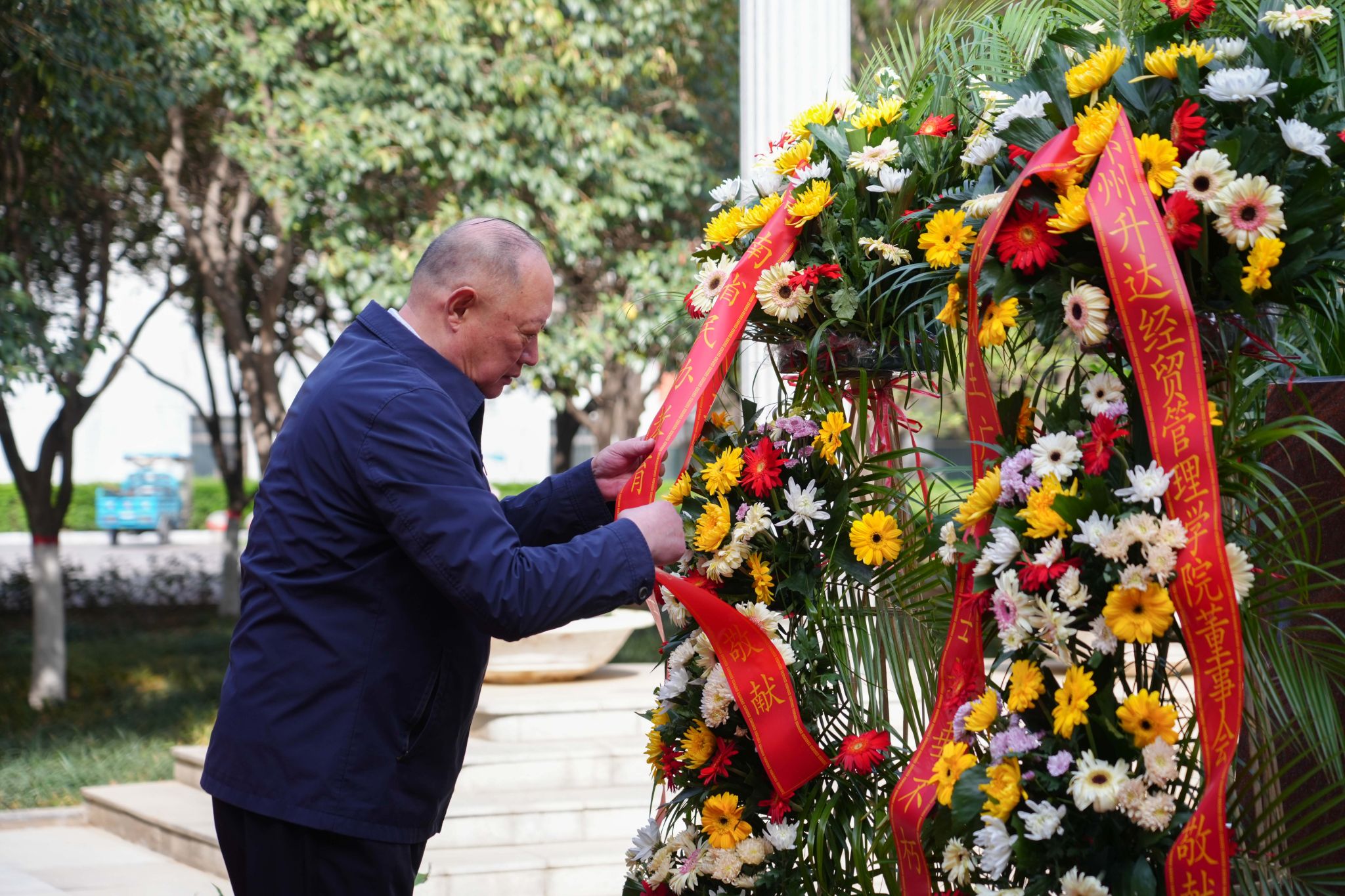 接着,董事长王新奇、实训与设备管理处处长程敏姿代表董事会敬献花篮并整理花篮缎带。河南省民办教育协会会长任锋代表协会敬献花篮并整理花篮缎带。党委书记雷霆,校长张欣,党委副书记、副校长张金安,副校长张其武等校领导敬献鲜花。邵明、李红杰、刘亚锋、杨波、徐阳等校友代表全体校友敬献鲜花。学校中层干部和学生代表敬献鲜花。大家真切地表达了对创办人的无限敬仰和哀思,感恩他为文化教育事业、民办教育事业发展做出的卓越贡献。