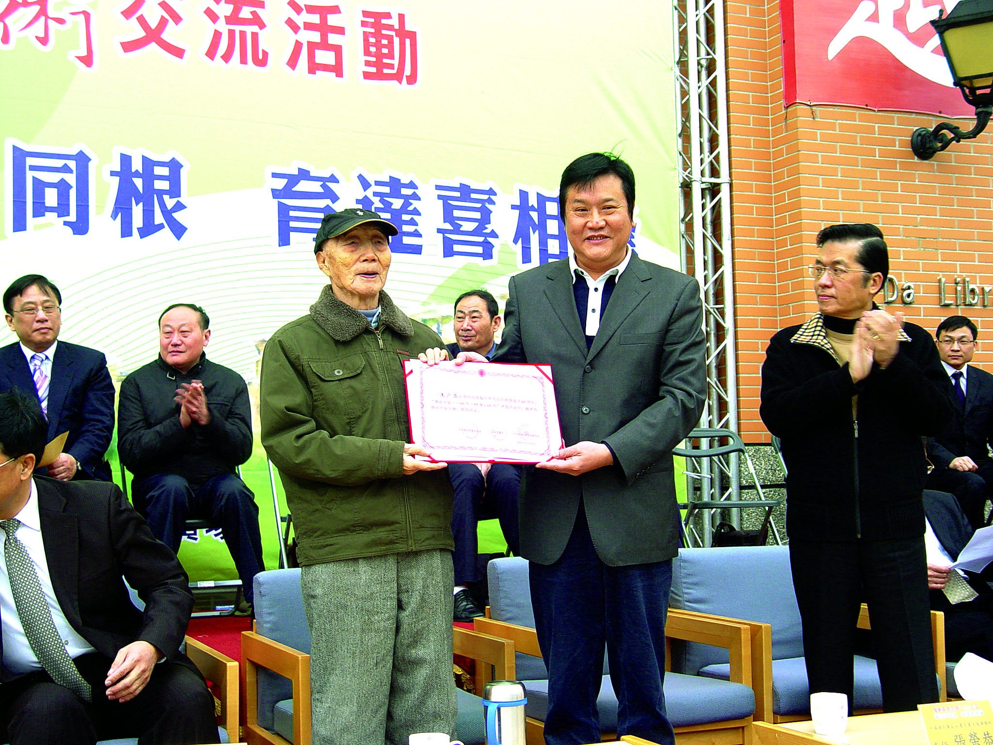 时任河南省副省长赵建才(右)为创办人颁发“感动中原60年60人”荣誉证书