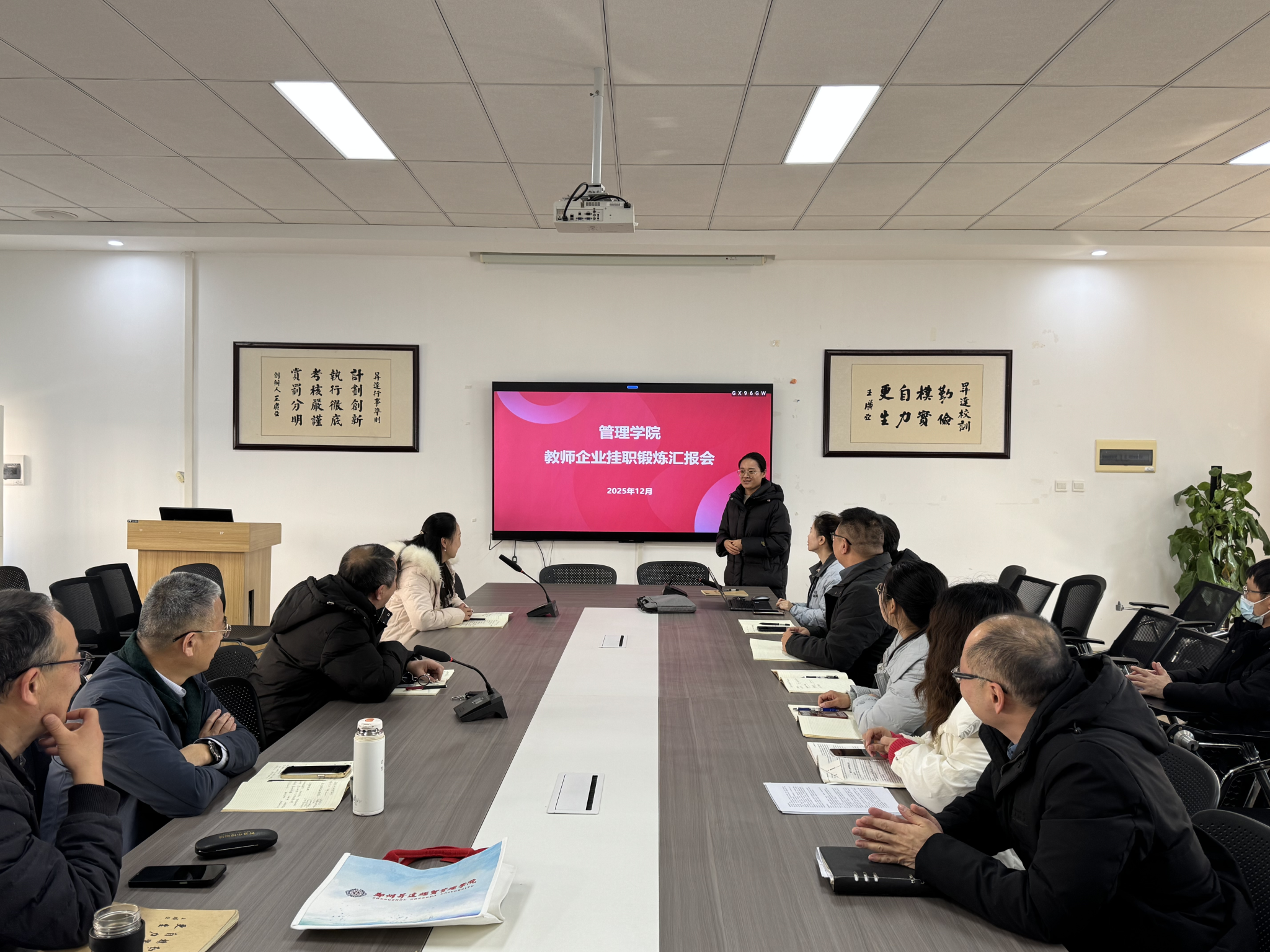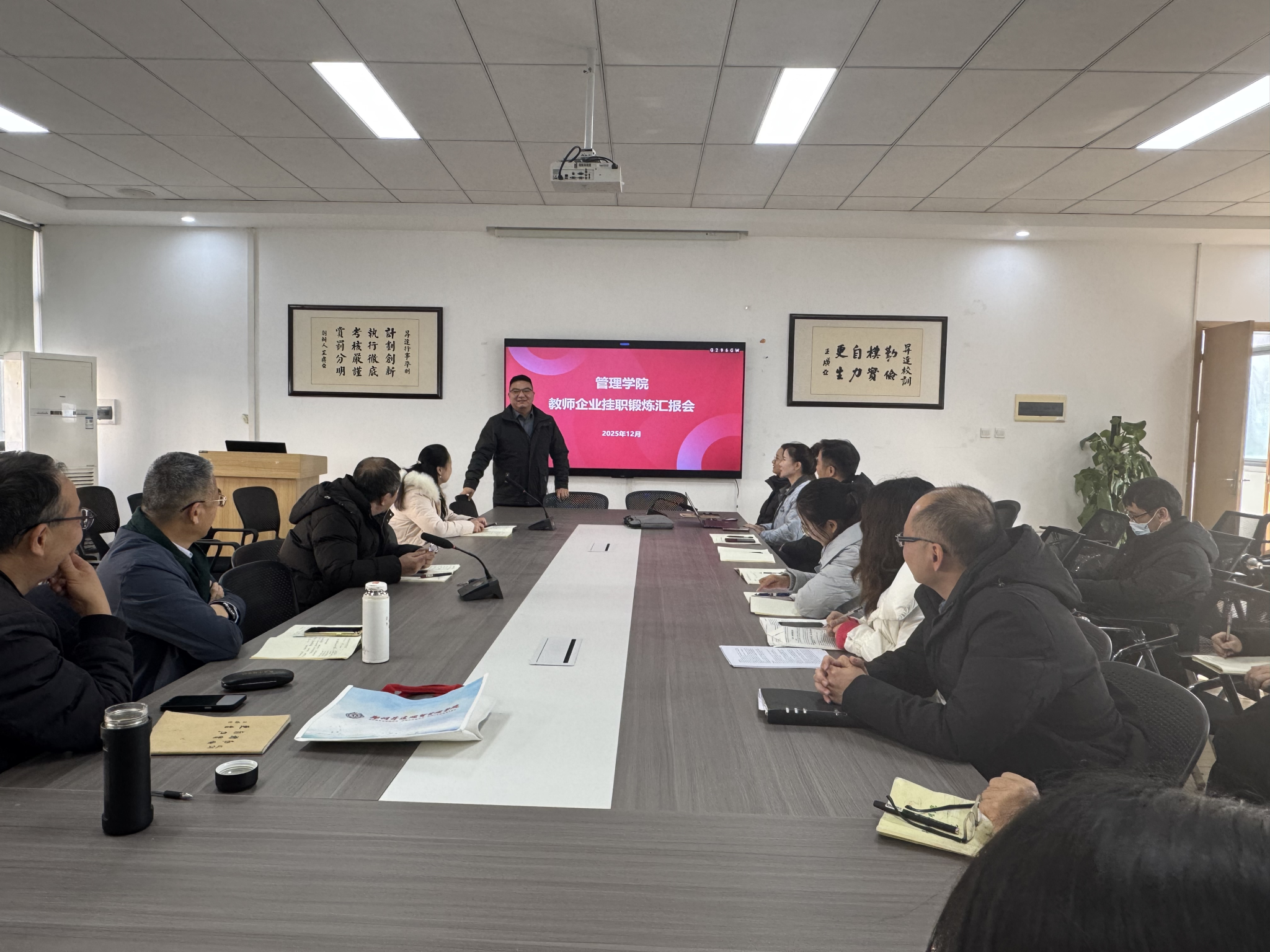 为进一步深化产教融合,提升应用型人才培养质量,2025年12月25日,管理学院工商管理教研室在教学2号楼209会议室召开第十一批教师挂职锻炼汇报会,王玉杰老师和叶文菲老师分别围绕其企业挂职经历和主要收获展开汇报。