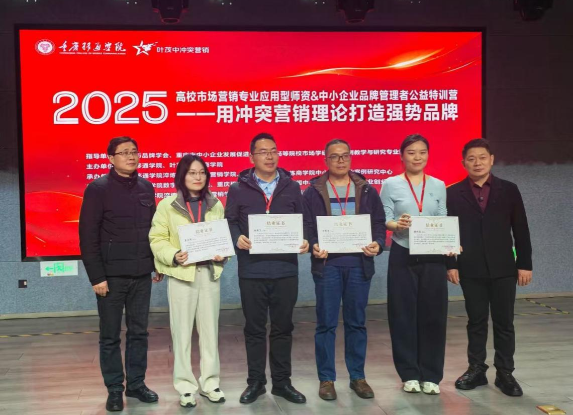 2025年12月25日-28日,商学院院长白朋飞,带领广告专业教研室主任张冰晶,教师宁震霖、李亦骐赴渝参加重庆移通学院淬炼商学院举办的公益特训营。本次特训营主题为“用冲突营销理论打造强势品牌”,主讲嘉宾为国内知名营销学专家连漪教授及营销实战派领袖、叶茂中先生大弟子丁士安院长。