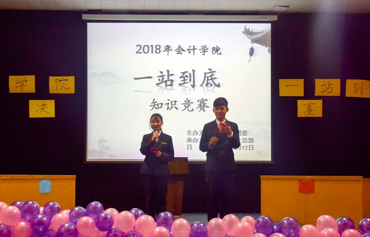 为了普及大学生的课外知识,推动校园文化建设,提高大学生综合素质,拓展大学生视野。会计学院于2018年12月12日晚上18:30在龙湖报告厅举办了“一站到底”知识竞赛。参加本次活动的领导及嘉宾有会计学院行政秘书兼团委书记陈刚老师,会计学院行政秘书兼团委副书记刘锦老师,会计学院第24届团委副书记徐林林,会计学院第24届学生会主席文静,会计学院第24届社团联合理事长周晨阳。