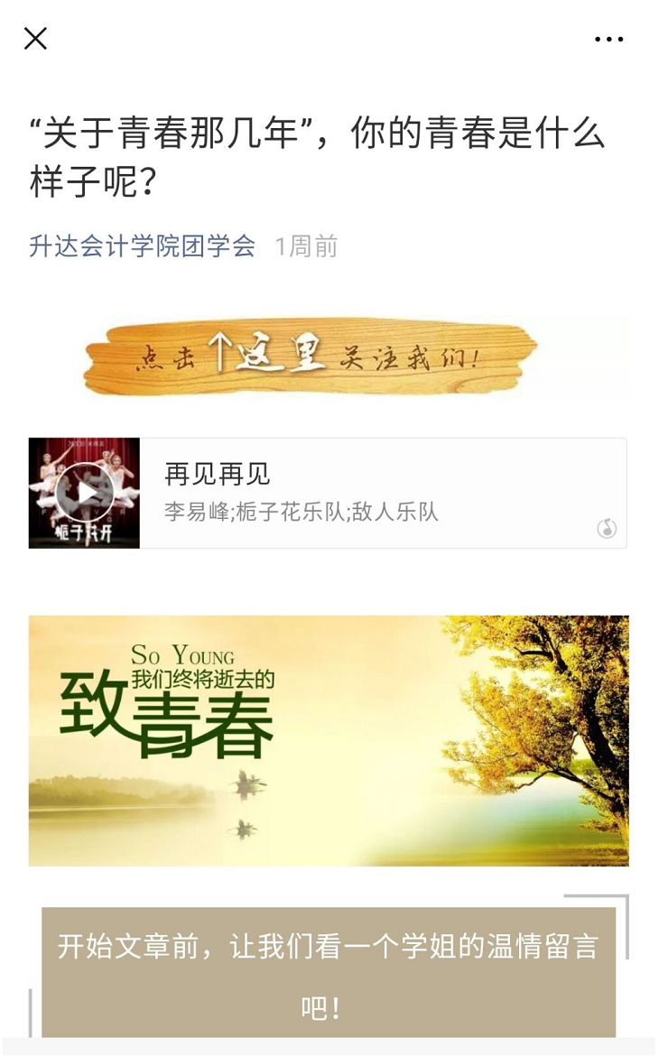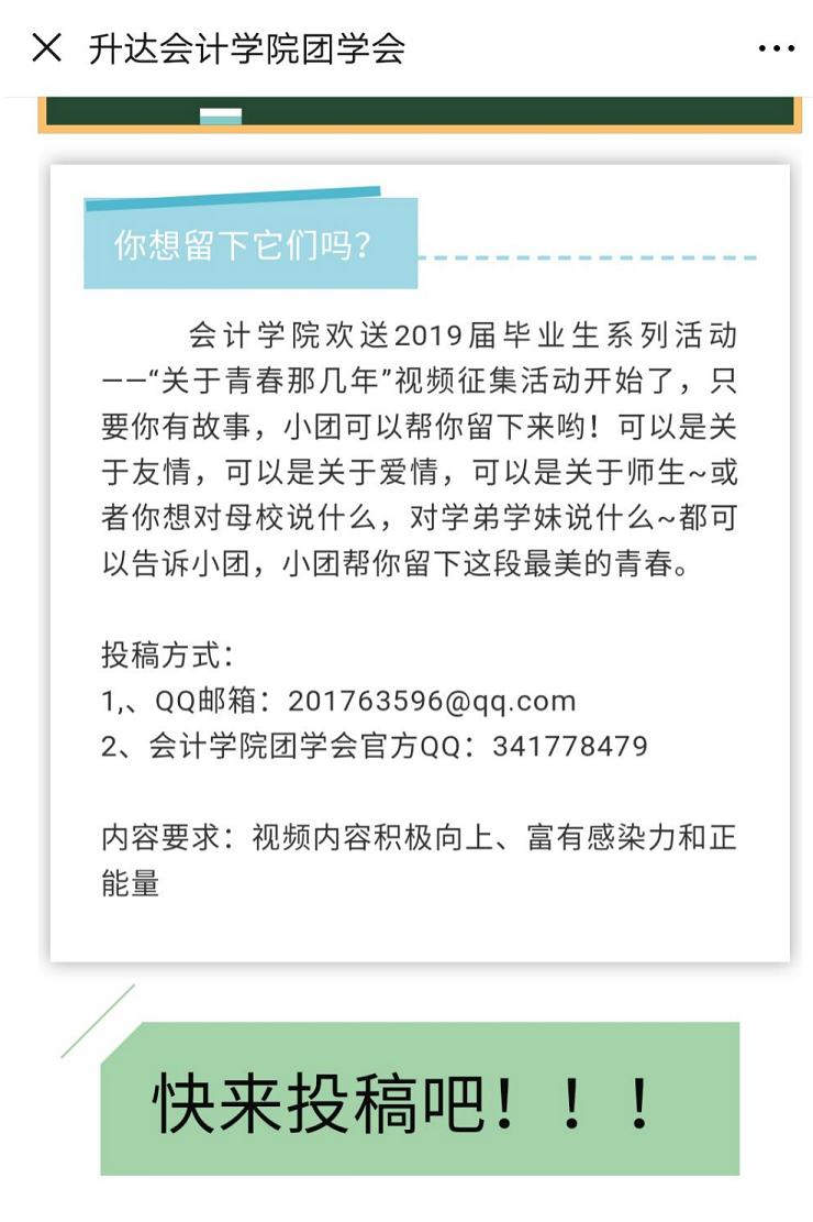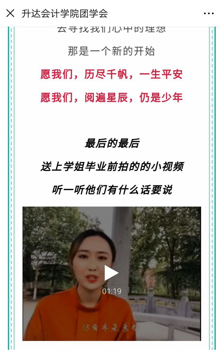 青春,说长也不长,说短也不短。大学的青春,最为绚丽多彩,因为在这个年纪的我们,有满腔的热血,有不撞南墙不回头的坚韧,有对新事物的憧憬……六月,是大四的学长学姐与达园分别的日子,他们,在达园里度过了属于他们的四年,度过了他们的青春。他们青春的记忆,在达园的每一个角落。为了让他们的青春不留遗憾,给大学的生活画上一个圆满的句号,也为了给达园的小伙伴一些关于青春的建议,会计学院团委通过微信公众平台,QQ空间,微博于线上举办了"关于青春那几年"视频征集为主题的毕业季系列活动。