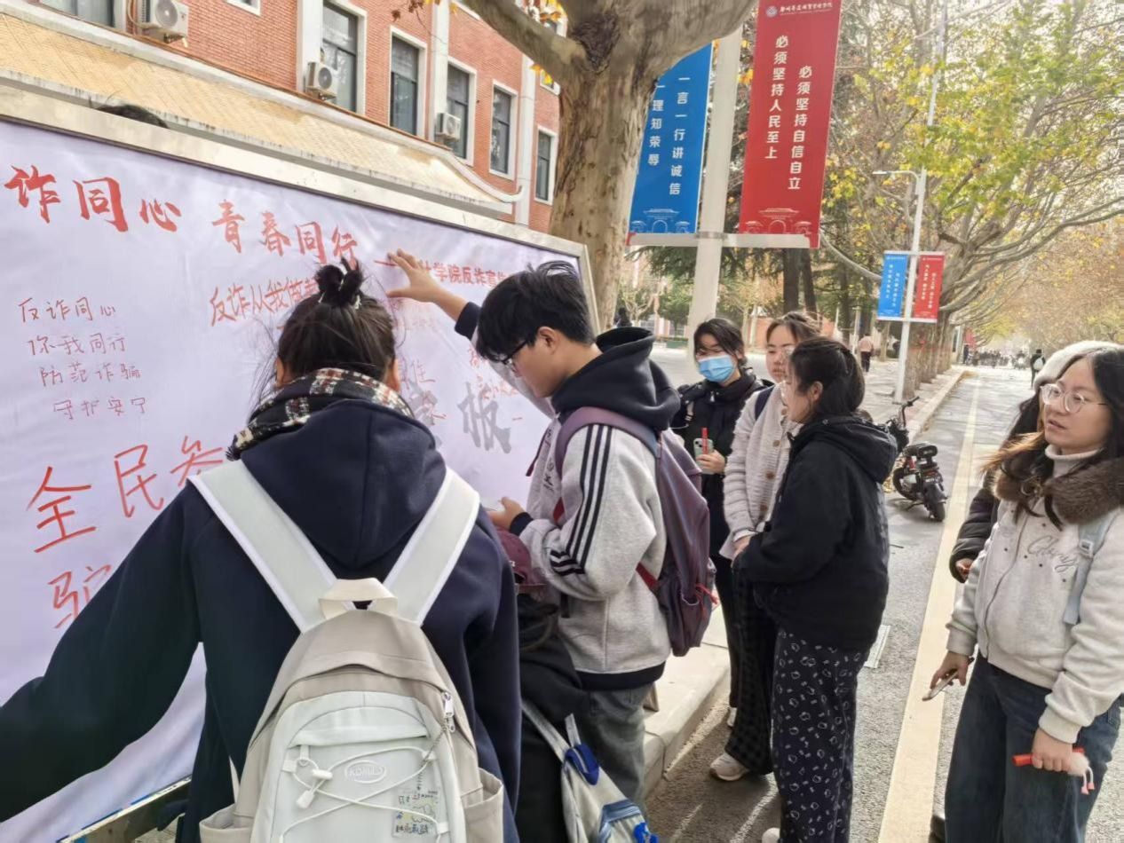 活动开始后,展板前聚集了不少驻足观看的同学。在“反诈我承诺”签名墙前,同学们郑重签下自己的名字,表达坚决抵制电信诈骗的决心。一旁的“反诈警示语征集区”更是气氛热烈,同学们纷纷提笔写下“反诈从我做起”“刷单返利全是坑”等生动实用的防诈骗宣传标语,展现了青年一代的反诈智慧与责任感,这种形式的反诈宣传既直观又深刻。