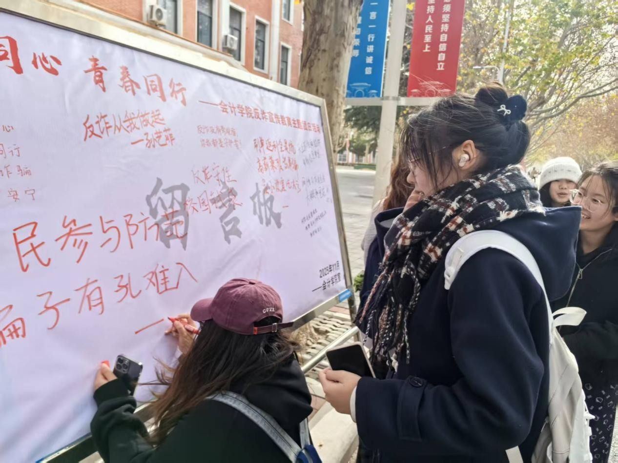 为提升会计学院学子防范电信诈骗的意识和能力,营造校园反诈防骗的浓厚氛围。11月24日,由会计学院团委主办的“反诈同心,青春同行”会计学院反诈宣传教育主题团日活动于教学四号楼外顺利开展。活动通过设置反诈主题展板、发起集体签名、征集反诈警示语等形式,吸引了会计学院广大青年学生的积极参与。