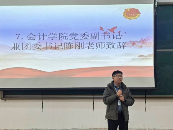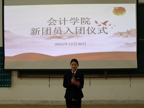 为凝聚青年力量,筑牢信仰之基,引导青年学子坚定理想信念、践行青春使命。12月30日中午12:00,由会计学院团委主办,会计学院组织部承办的新团员入团仪式在教学四号楼118教室隆重举行。会计学院党委副书记兼团委书记陈刚老师、24级团总支书记董婉婉老师、25级团总支书记刘瑞雯老师、会计学院第31届团学主要骨干及新团员们参与本次入团仪式。