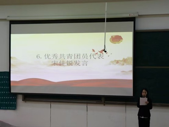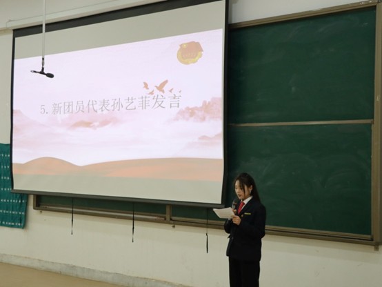 在宣誓环节,新团员们身姿挺拔,目光坚定,用庄重的姿态迎接属于自己的青春荣光。佩戴完毕后,新团员代表孙艺菲登台发言,铿锵的誓言彰显了新时代青年矢志不渝的信仰。随后,优秀共青团员代表宋佳锐分享成长感悟,为新团员树立了奋进标杆。