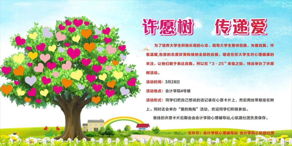善爱我许愿树活动于3月28日在会计学院4号楼举办,学生们可以将自己想说的话,自己的内心想法记录在卡片上,用丝带悬挂在许愿树上,悬挂的许愿卡片后期会由会计学院心理辅导站,心航路社团保存。