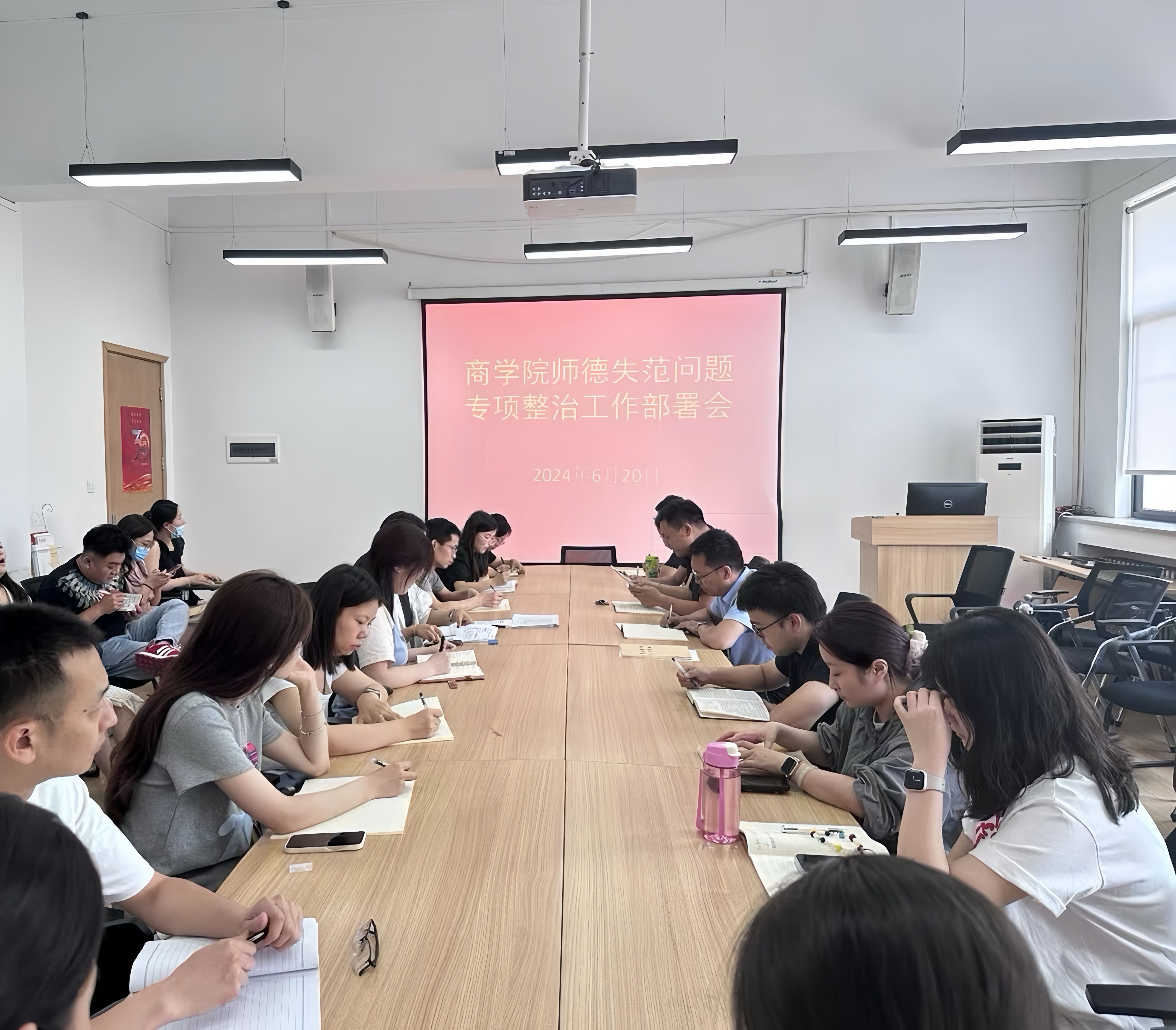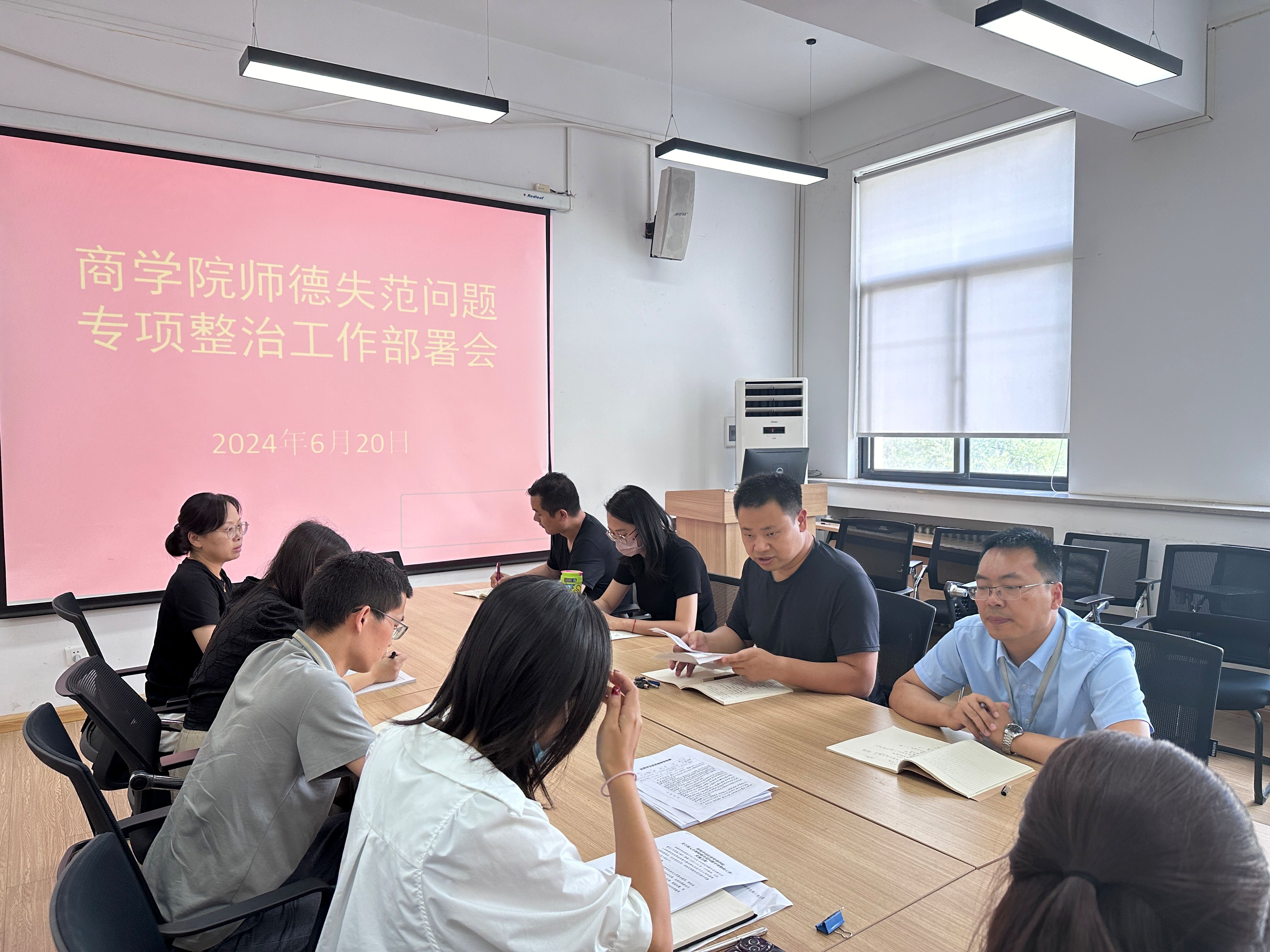 为进一步统一思想、提高认识,全面加强师德师风建设,切实解决师德失范问题,营造风清气正的育人环境,6月20日,商学院在教学楼2号楼315会议室组织召开了师德失范问题专项整治工作部署会议。商学院党委书记郭峰、院长白朋飞、行政秘书郗艳花、教学秘书马巧丽、学院各党支部书记及全体辅导员老师参加。