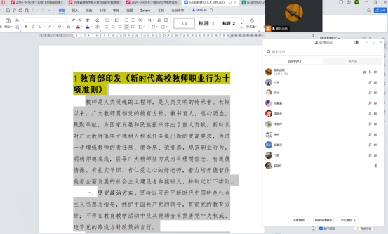 随后,与会教师围绕《新时代高校教师职业行为十项准则》进行了深入学习和讨论。大家一致认为,准则从坚定政治方向、自觉爱国守法、传播优秀文化、潜心教书育人、关心爱护学生、坚守廉洁自律、积极奉献社会等方面,对教师职业行为提出了明确的要求和规范,是新时代高校教师职业道德建设的重要遵循。