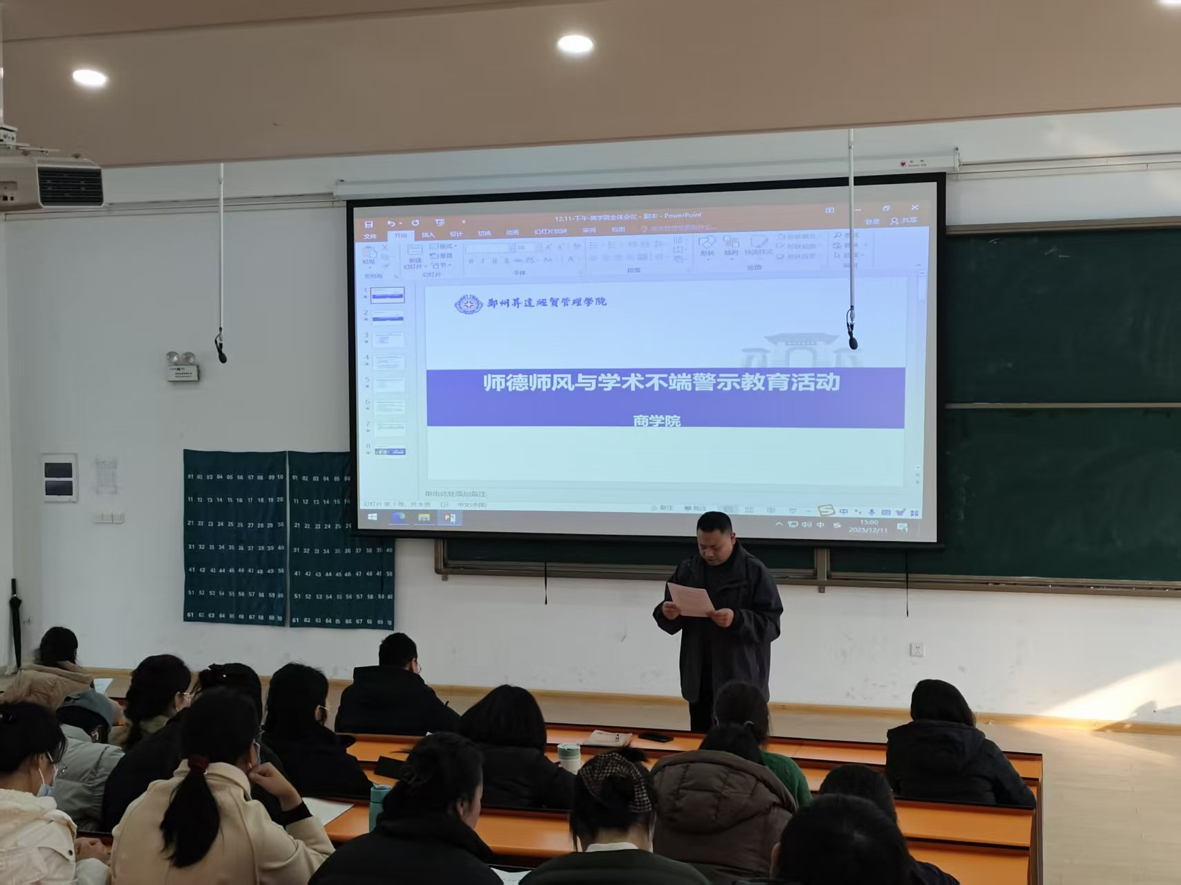 为深入贯彻落实上级教育部门及学校关于师德师风建设和学术诚信教育的工作要求,强化教师职业道德修养,严守学术行为规范,12月11日下午,商学院在教学二号楼116教室召开师德师风与学术不端警示教育专题活动。学院党委书记郭峰、党委副书记郗艳花、院长白朋飞、教学秘书马巧丽及全体教职工参会,会议由马巧丽主持。