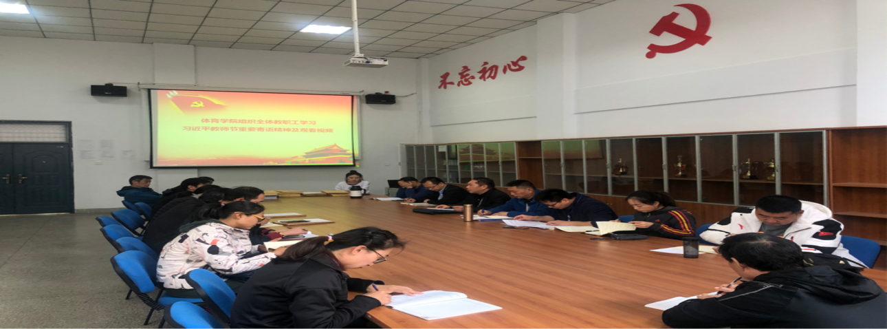 为贯彻落实习近平总书记教师节重要寄语精神,11月19日下午,体育学院全体教职工在体育学院会议室观看了报告会视频。活动由院党总支书记杨明志主持。