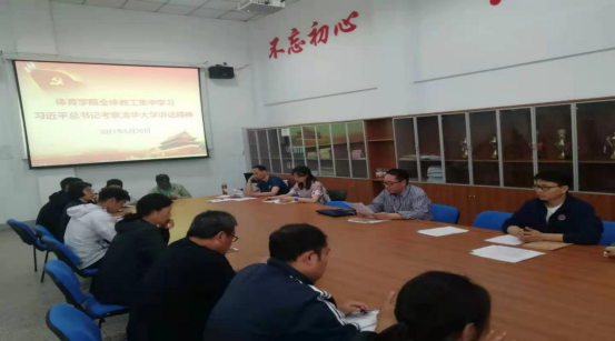 为深入学习贯彻习近平总书记在清华大学考察时讲话精神,进一步统一思想、提高认识,推动形成生动实践,扎实推进体育学院党史学习教育深入开展。5月20日下午,体育学院党总支在体育馆208会议室召开全体教工集中学习习近平总书记考察清华大学讲话精神会议。会议由体育学院党总支书记杨明志主持,体育学院全体教职员工参加会议。