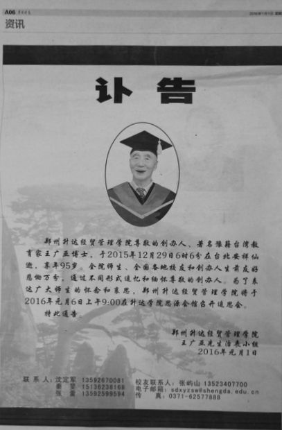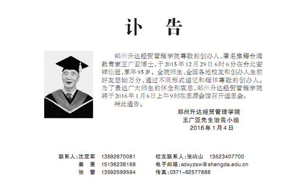近日,河南日报在1月4日第五版,大河报在1月4日A04整版,郑州晚报在1月1日A6整版分别刊发创办人王广亚博士追思会通告。