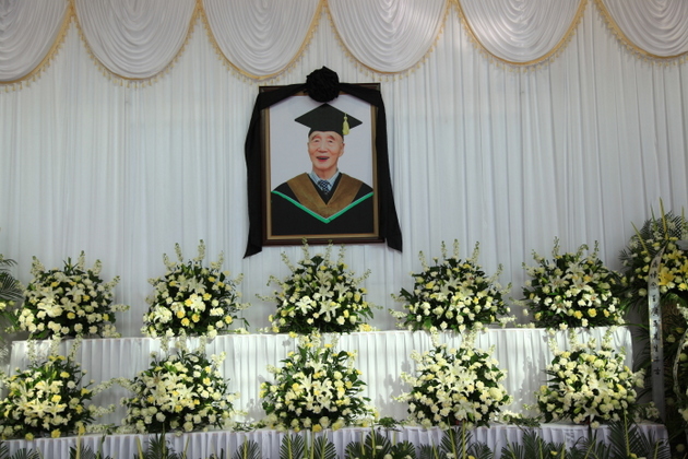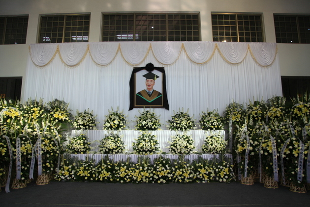12月30日上午,思源会馆正门大厅布置得庄严、肃穆。门前4个大柱上书写着:高风传梓里,亮节昭后人;人去音容在,身无志犹存。从高大的会馆楼顶,直落地面悬挂着一幅巨大挽联:潜心育桃李勤俭朴实自力更生广亚校训育众生,躬耕驻杏坛伦理创新品质绩效王公理念传永世;横幅:沉痛悼念王广亚先生。吊唁大厅,摆放着一排排由青松翠柏与百合、白玫瑰、黄白菊花组成的花篮、花环。身着博士服、头戴博士帽的创办人大幅照片挂在大厅中央。
